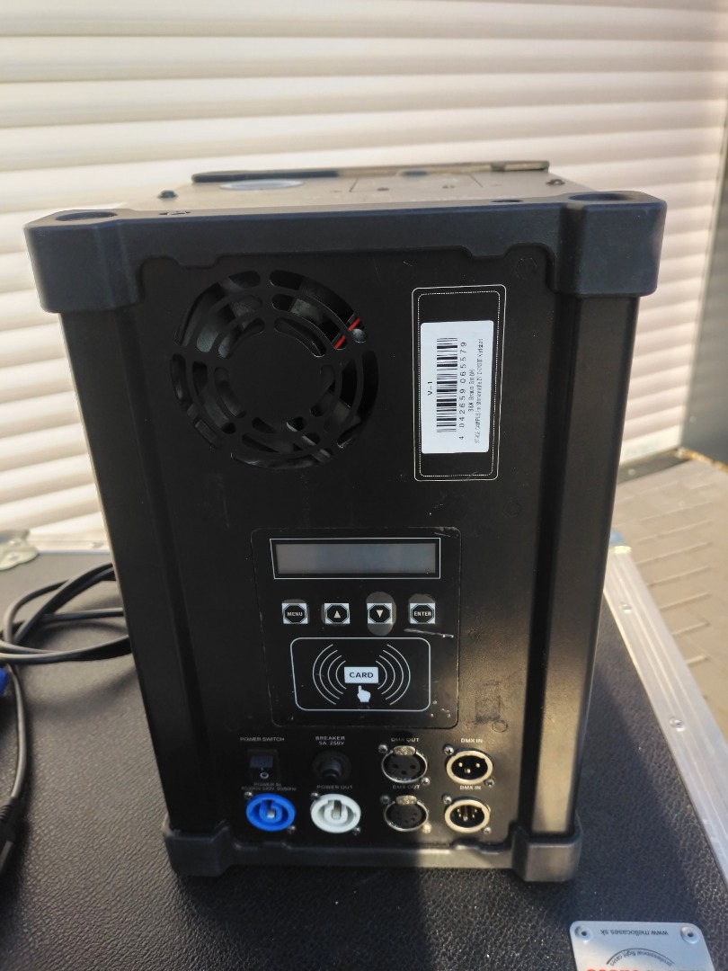 Der Spark V-1 kann mittels DMX512 angesteuert werden. Dafür stehen sowohl 3pol, als auch 5pol XLR Anschlüsse zur Verfügung. Für die Bedienung des Spark V-1 ist außerdem keinerlei Schein erforderlich, da es sich nicht um Pyrotechnik handelt.