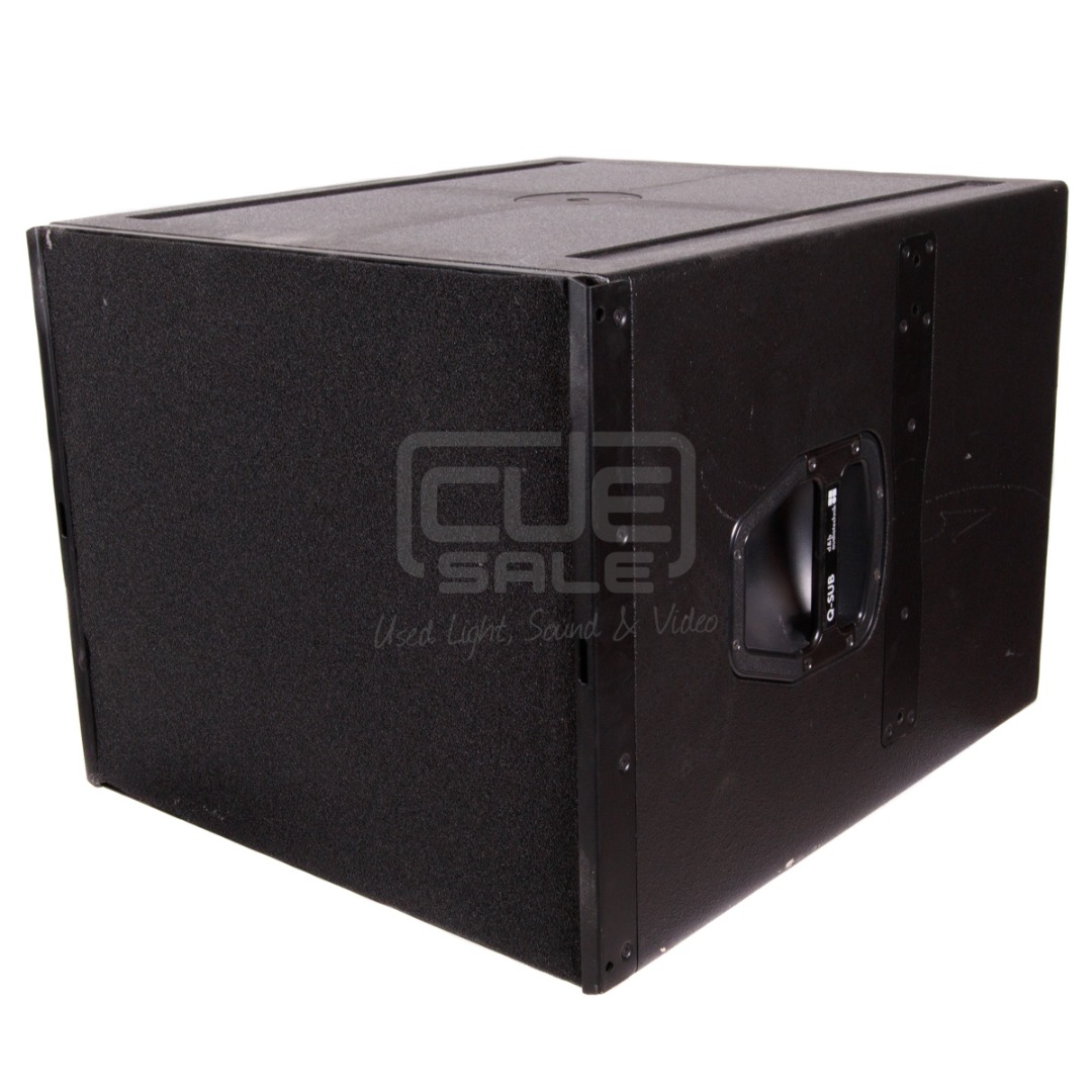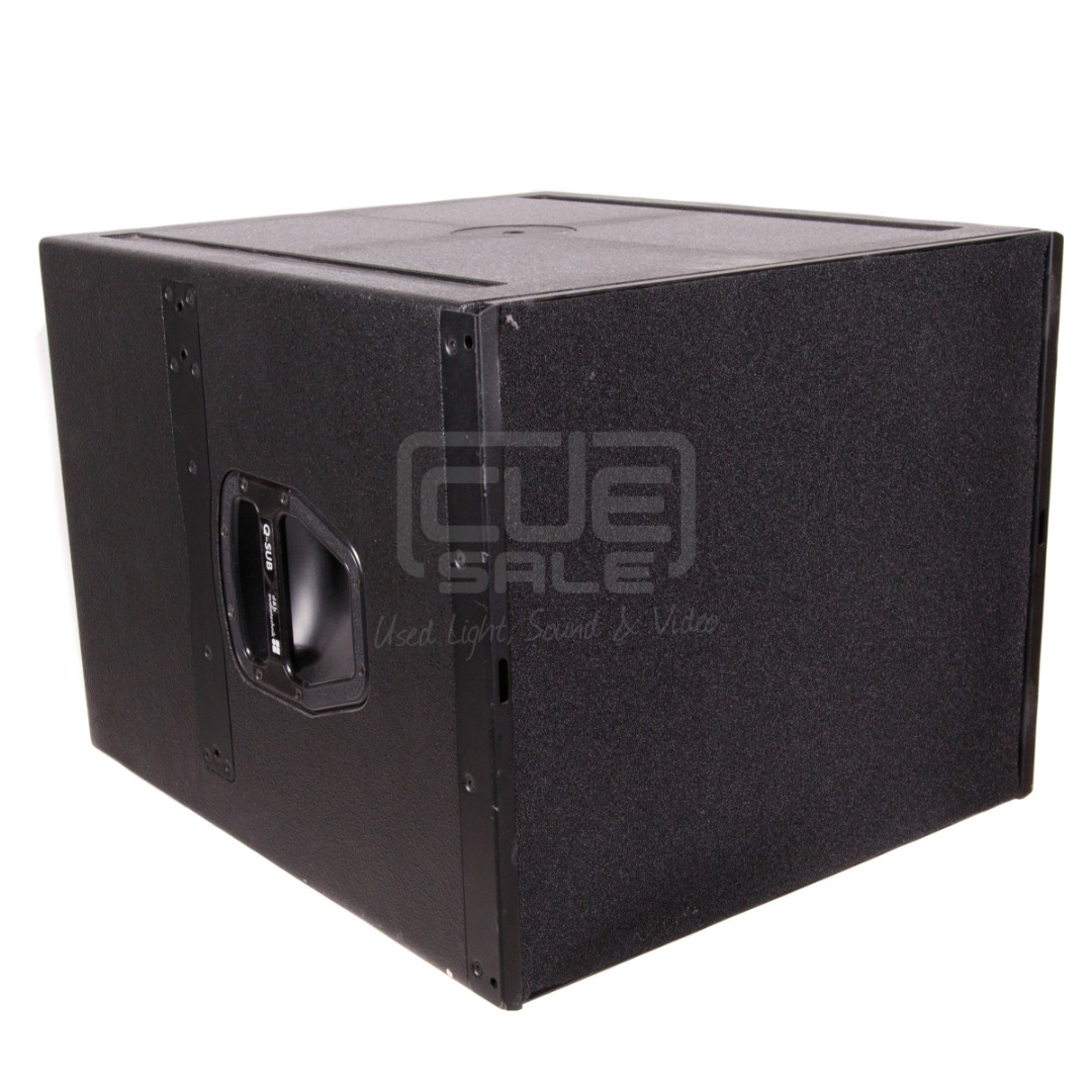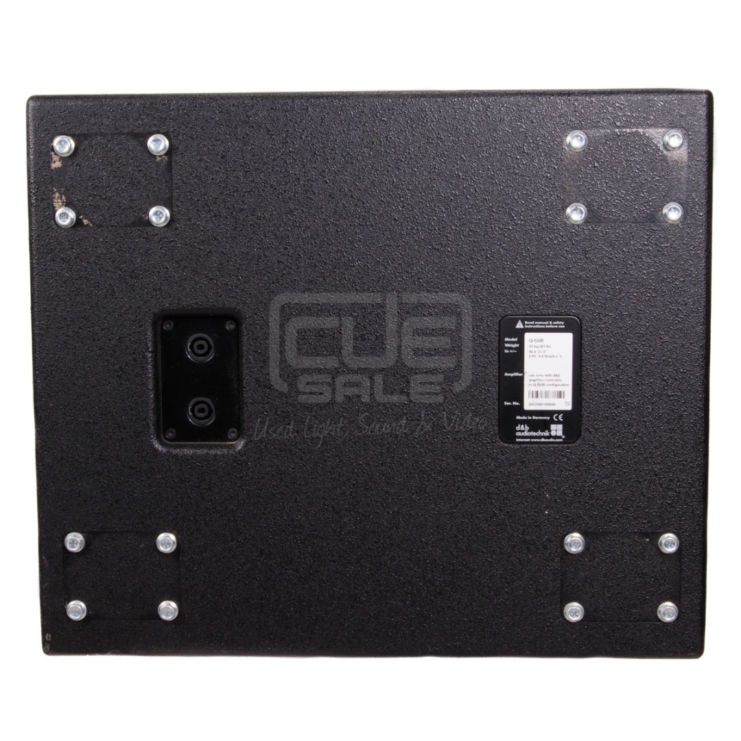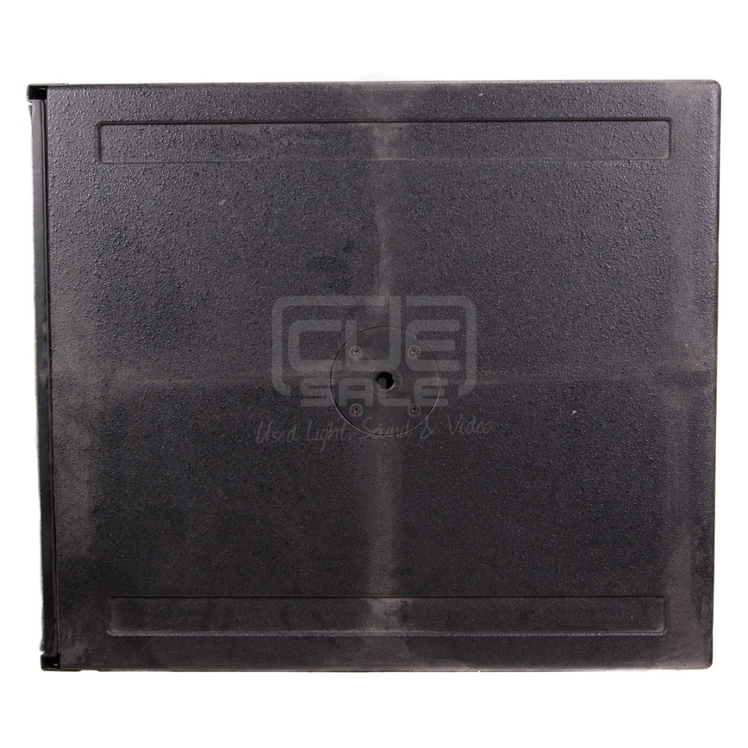 The Q-SUB is an actively driven low compression bass-reflex loudspeaker fitted with a high excursion 18″ driver. d&b SenseDrive technology is available when powered by the D12 amplifier. The Q-SUB is mechanically compatible with the Q1 and Q7; ten sockets in the front grill and side panels for Q-Series rigging components permit use in various combinations, either flown or ground stacked. The Q-SUB cabinet is constructed from marine plywood with an impact resistant paint finish, a pair of handles, four heavy duty wheels and an M20 threaded flange in the top panel to accept a loudspeaker stand. The front of the loudspeaker cabinet is protected by a rigid metal grill covered with replaceable acoustically transparent foam and two EP5 or NL4 connectors wired in parallel are mounted on the rear panel. Two runners protect the bottom of the cabinet from scratching; these are located in correspondingly shaped recesses in the top panel to prevent movement when stacked. Fittings for securing an optional wooden lid are also provided.