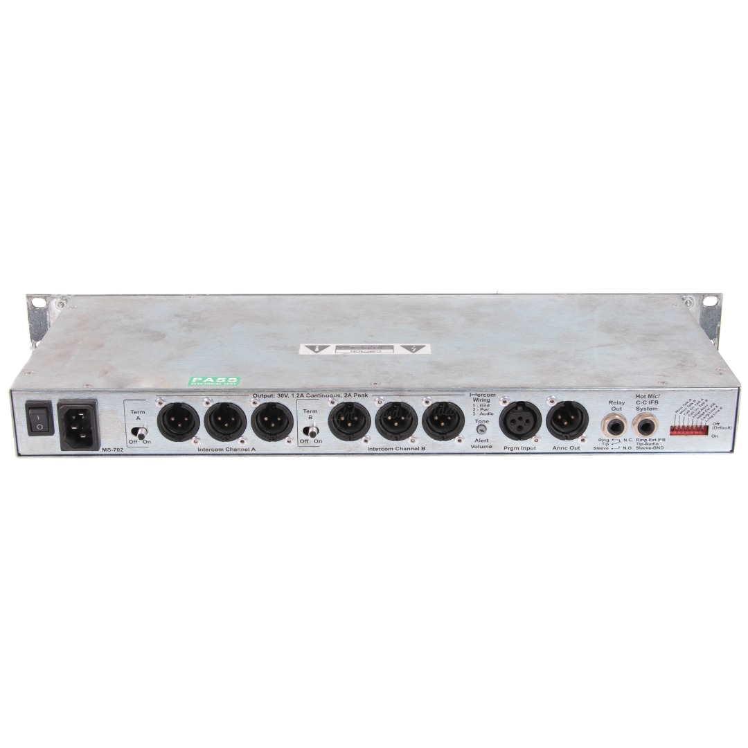 The MS-702 is a 1RU two-channel main station with programmable front panel buttons, individual channel short-circuit protection, individual channel volume control, and a regulated fail-safe power supply.