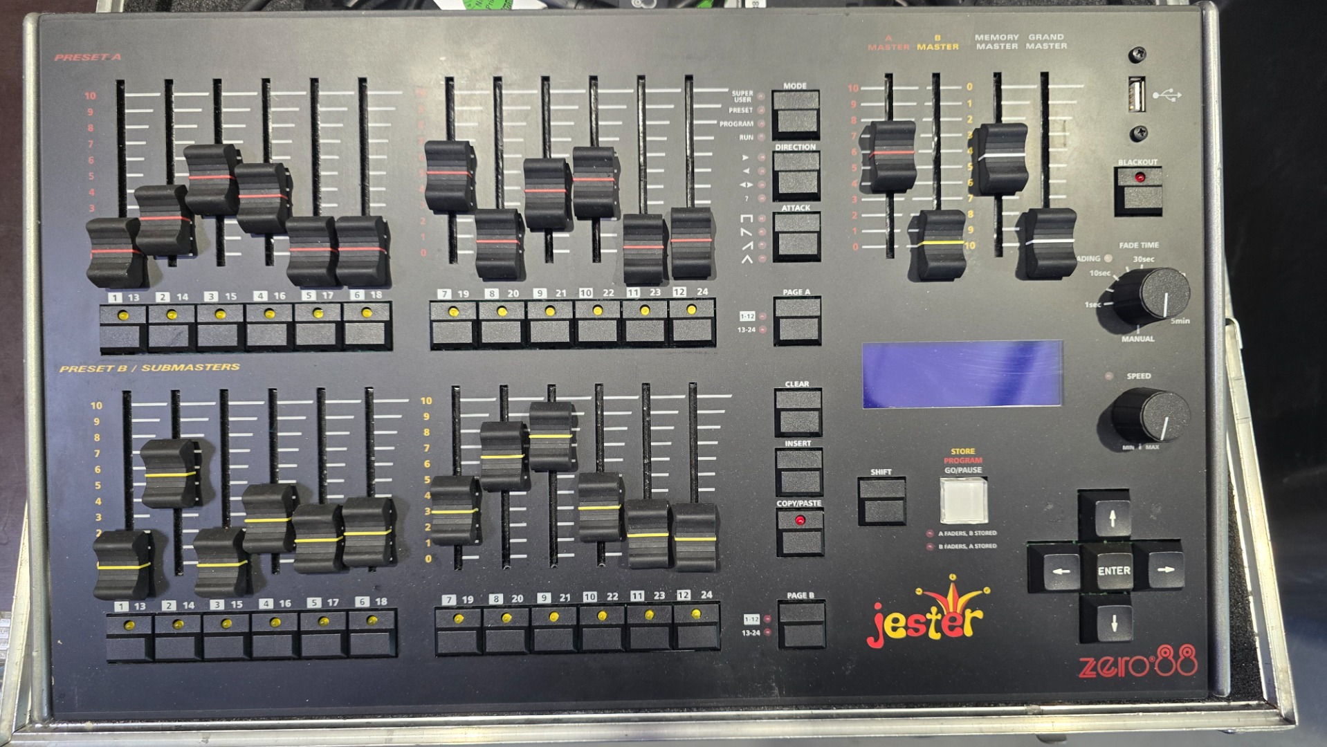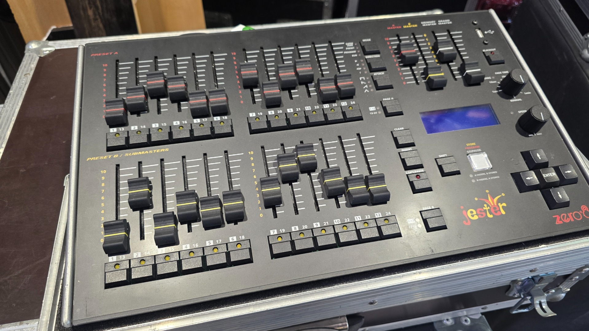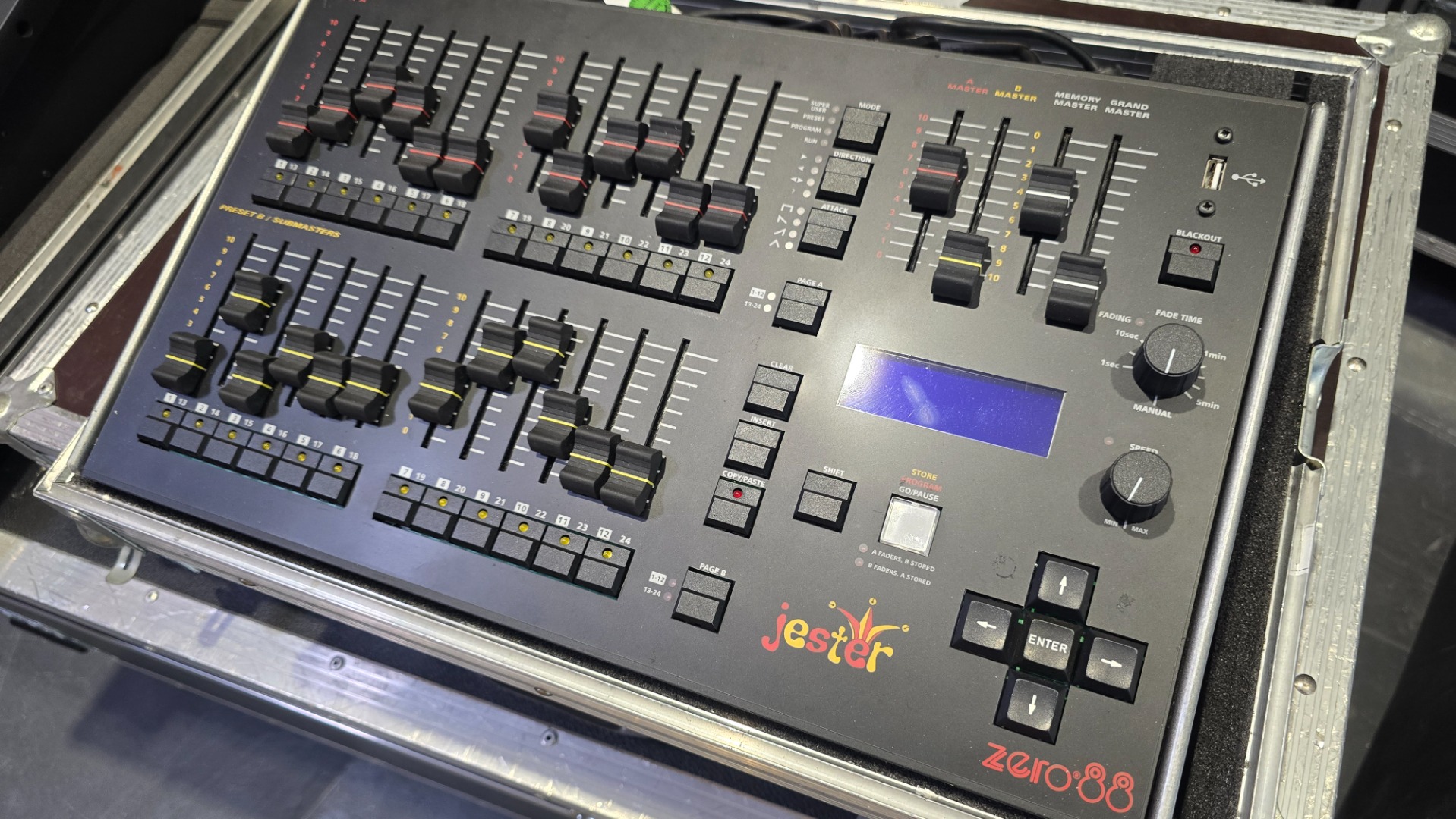 Das ZERO 88 Jester ersetzt die bekannten Pulte Elara und Alcora und verbindet die Features beider Konsolen. So lassen sich Szenen und Chaser direkt auf Submastern (Live Betrieb) als auch in einem Speicherstapel (Theaterbetrieb) speichern. Natürlich ist auch der einfache Zwei Preset Modus wählbar (und das auch im Wide Modus). Zusätzlich verfügt das Jester über die Möglichkeit die Kanalwerte von einem am Eingang angeschlossenen Lichtstellpult mit bis zu 512 Kanälen auf Submastern oder im Speicherstapel aufzuzeichnen. Für ein übersichtliches Arbeiten ist Jester mit einem SVGA Ausgang ausgestattet. Die Speicherung erfolgt im Pult oder über ein externes USB Speichermedium.