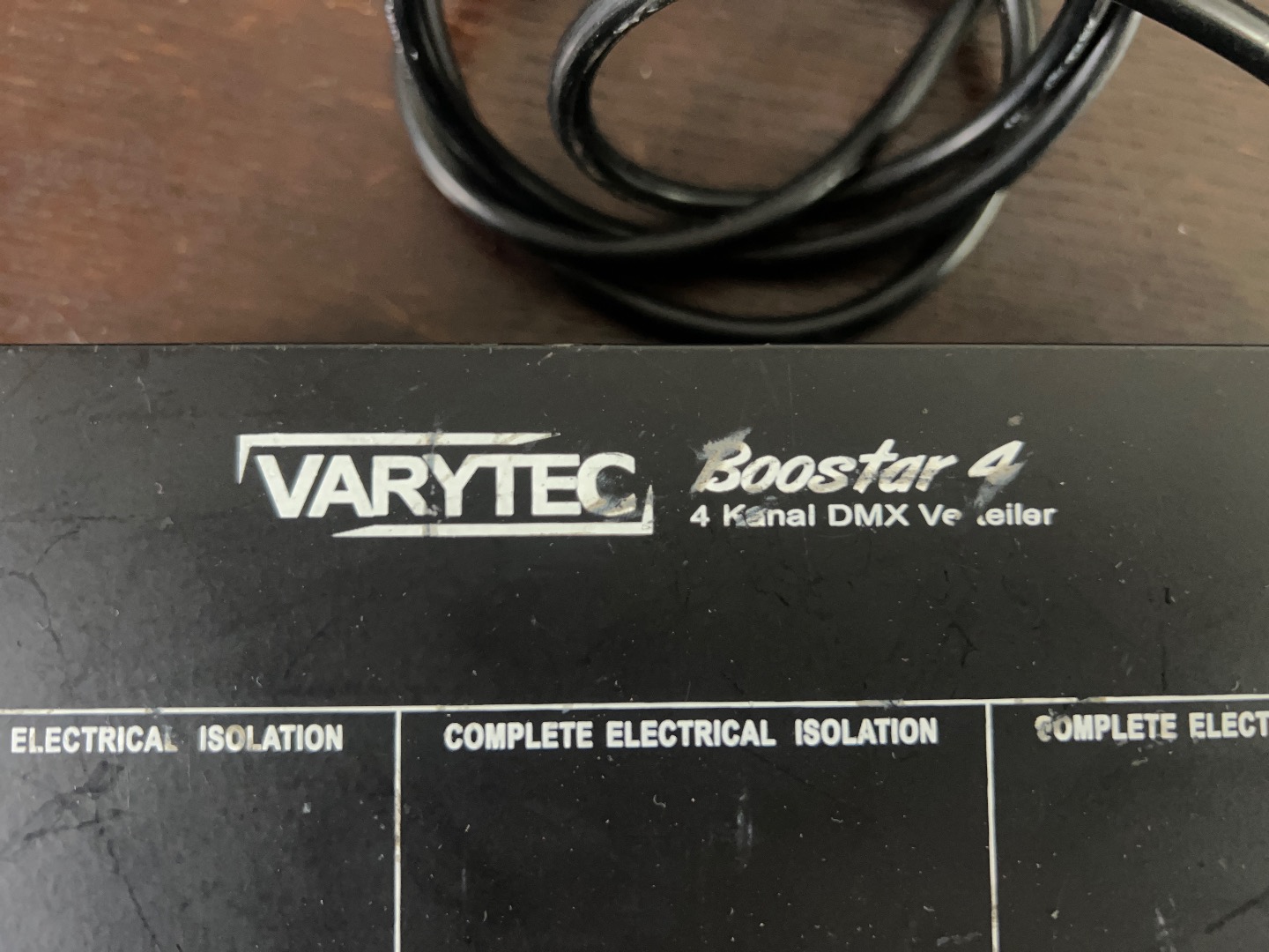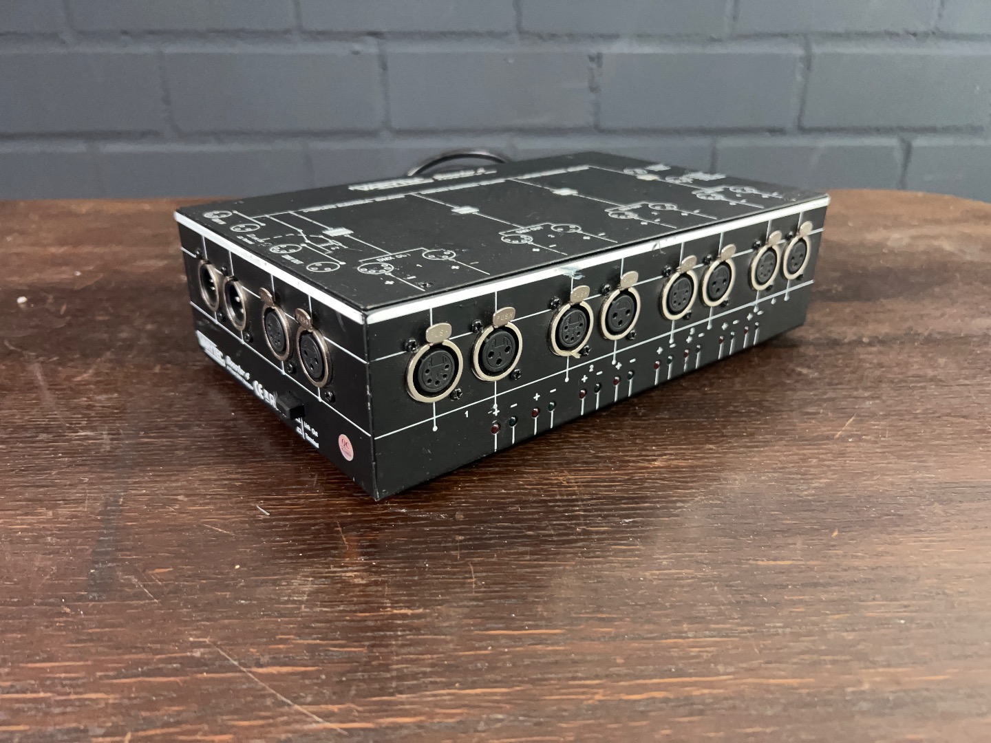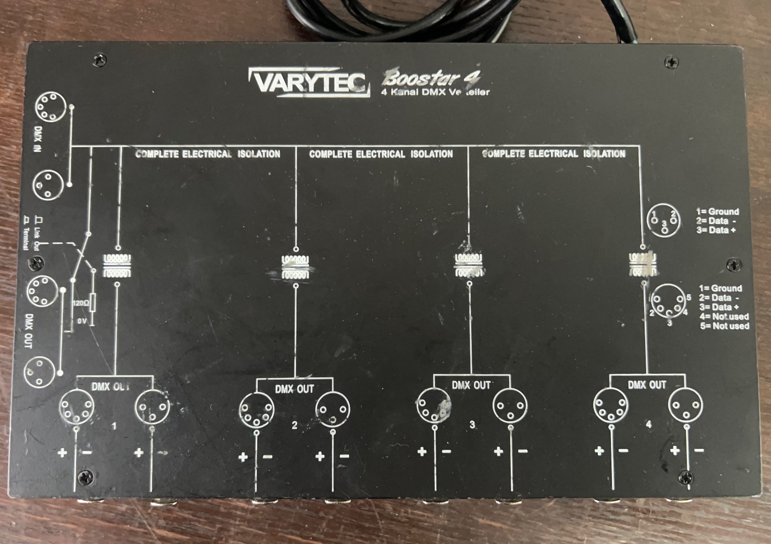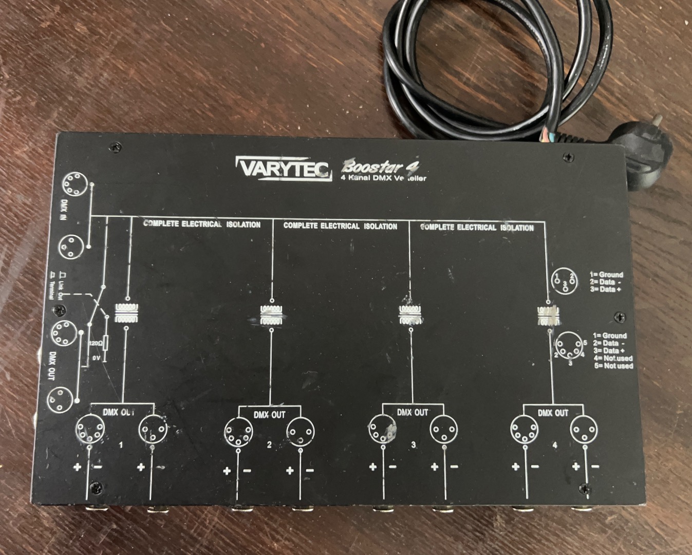 01 x 4-Fach DMX Splitter / -Booster mit 3- und 5-Pol Ein- und Ausgängen.