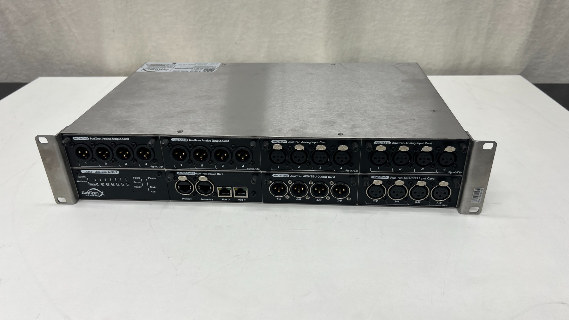 Zum Verkauf steht eine voll bestückte Auvitran AVBx7 Audio Toolbox, eine hochwertige modulare Audio-Netzwerkplattform für professionelle Anwendungen in Live-Sound, Broadcast, Festinstallationen oder Studio-Setups.