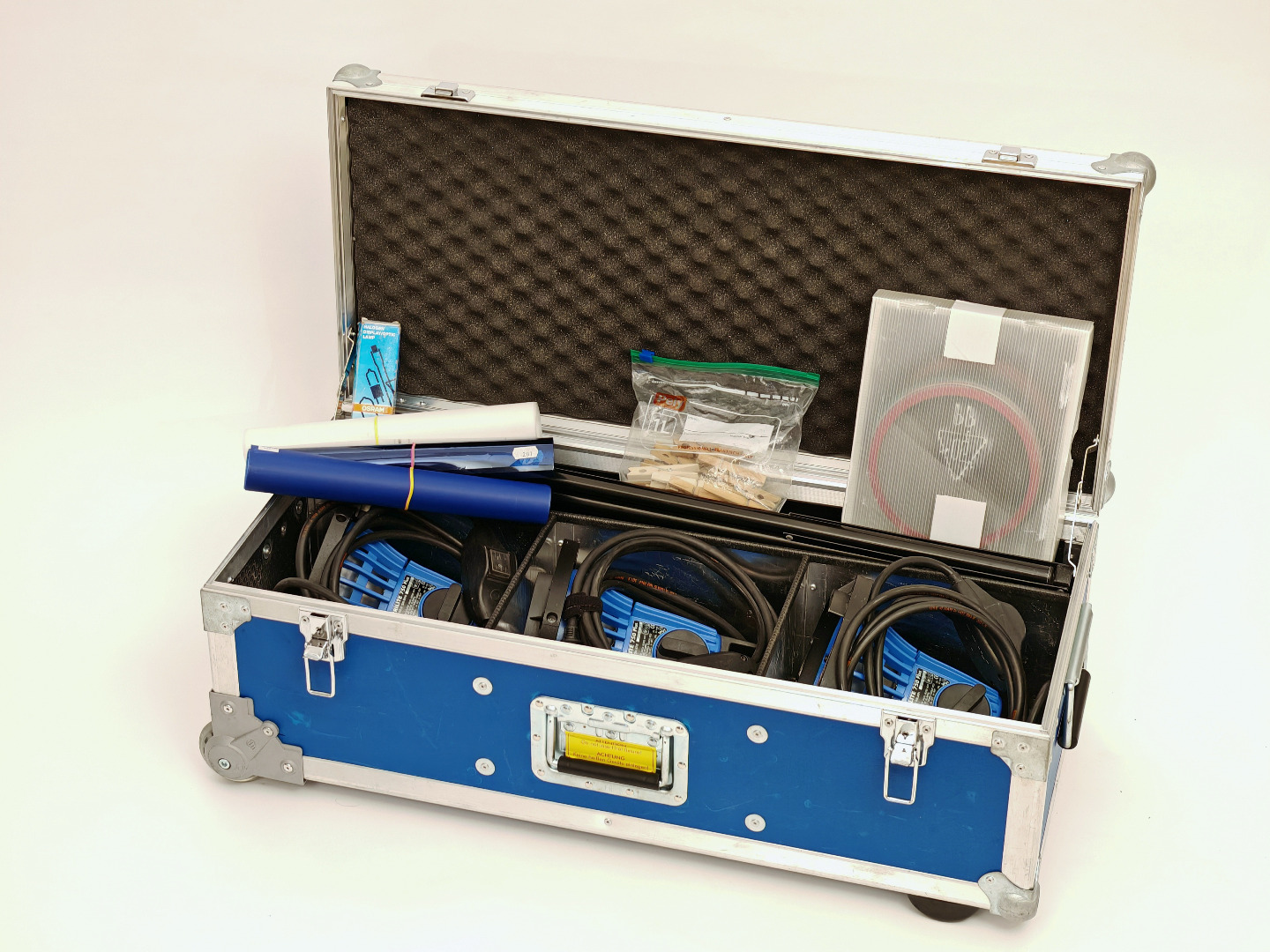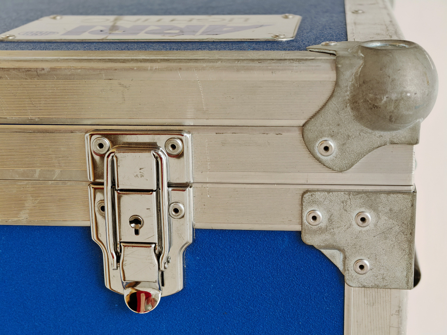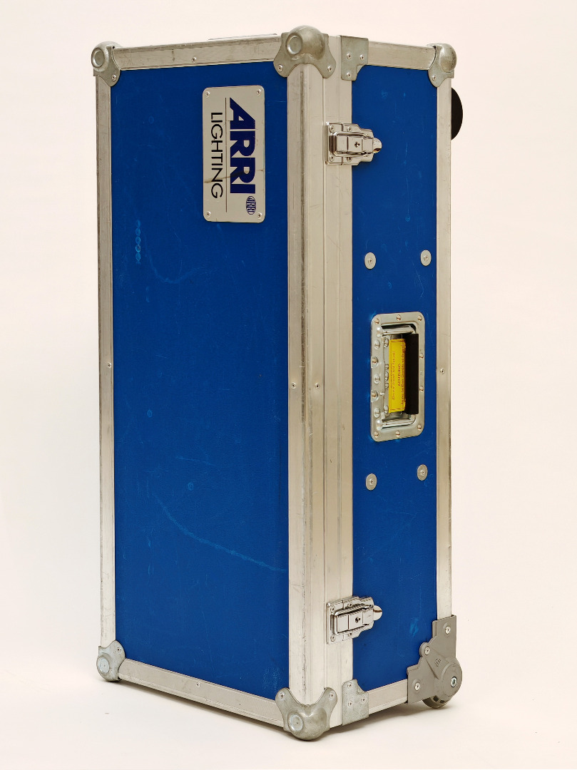 Das ARRI-Flightcase hat gegenüber der vom Werk gelieferten Version zwei zusätzliche Klappgriffe an den Seiten und Leichtlaufrollen. Es wird mit folgender Konfiguration verkauft: