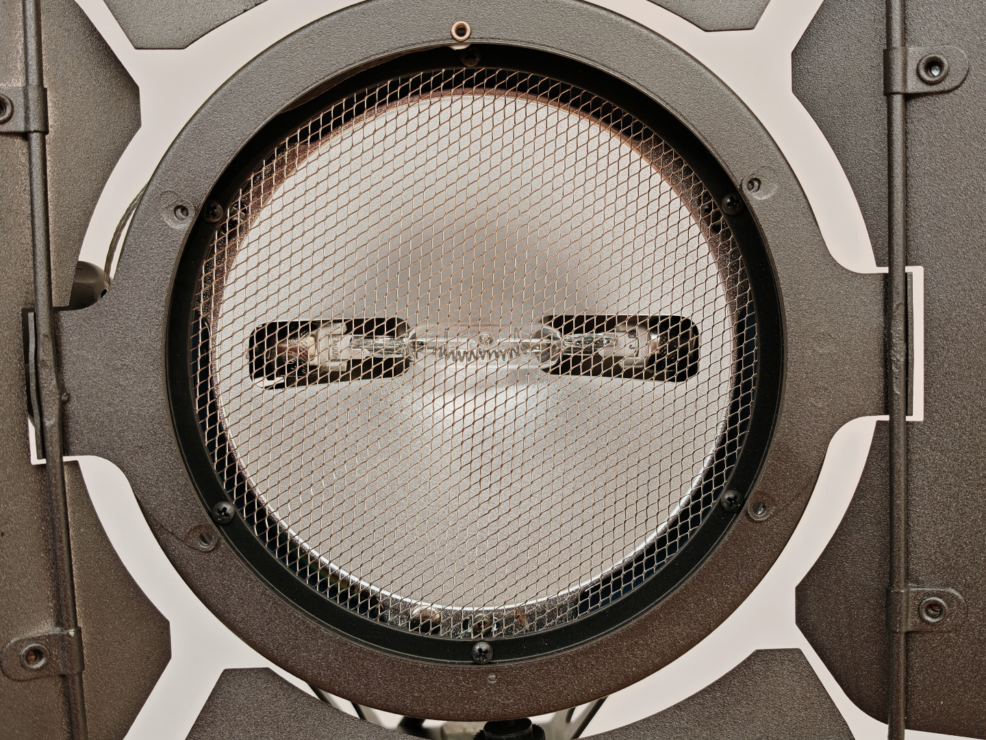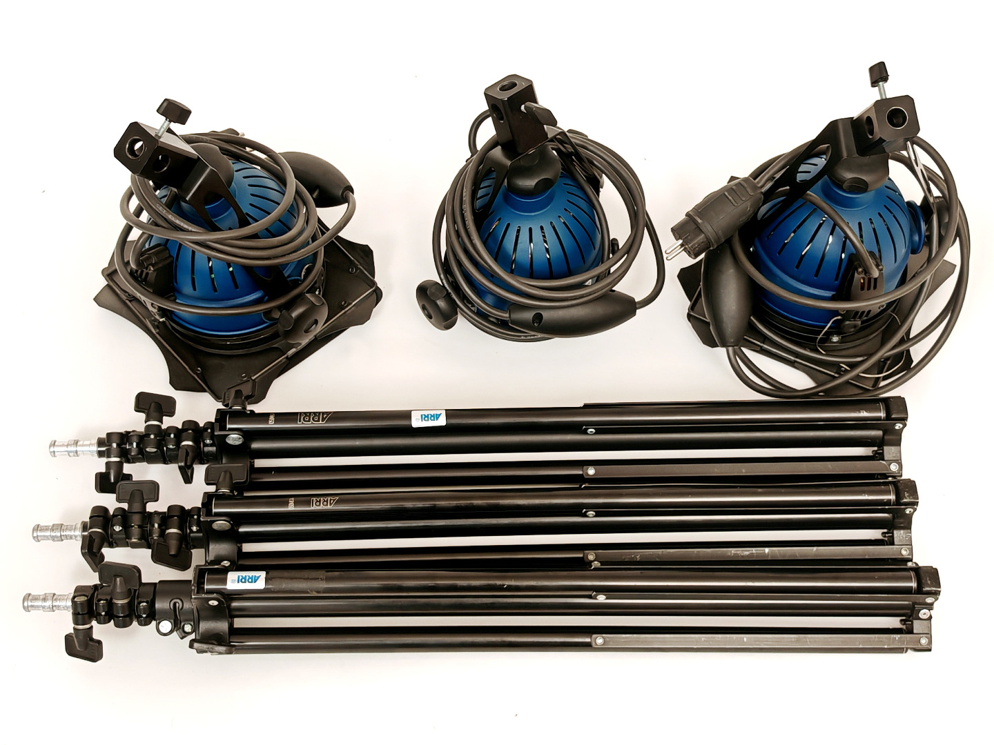 Das Set besteht aus 3 Leuchten des italienischen Herstellers D.T.S, sogenannte Bluehats mit einer Leistung von je 1KW (1000 Watt) Halogenlicht mit einer konstanten Farbtemperatur von 3200 K. Die Leuchten sind folussierbar und machen ein schönes gleichmäßiges Licht. Die Leuchten haben Torblenden mit Safetys (ACHTUNG: An einer Leuchte fehlt die Torblende, kann man aber sicher im Internet nachkaufen).