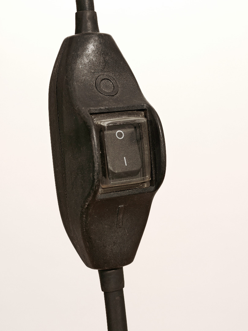 Es ist die schwarze Ausführung des sonst in silber/blau erhältlichen Scheinwerfers. Das Gerät hat einen Schuko-Stecker und einen Kippschalter am Kabel.