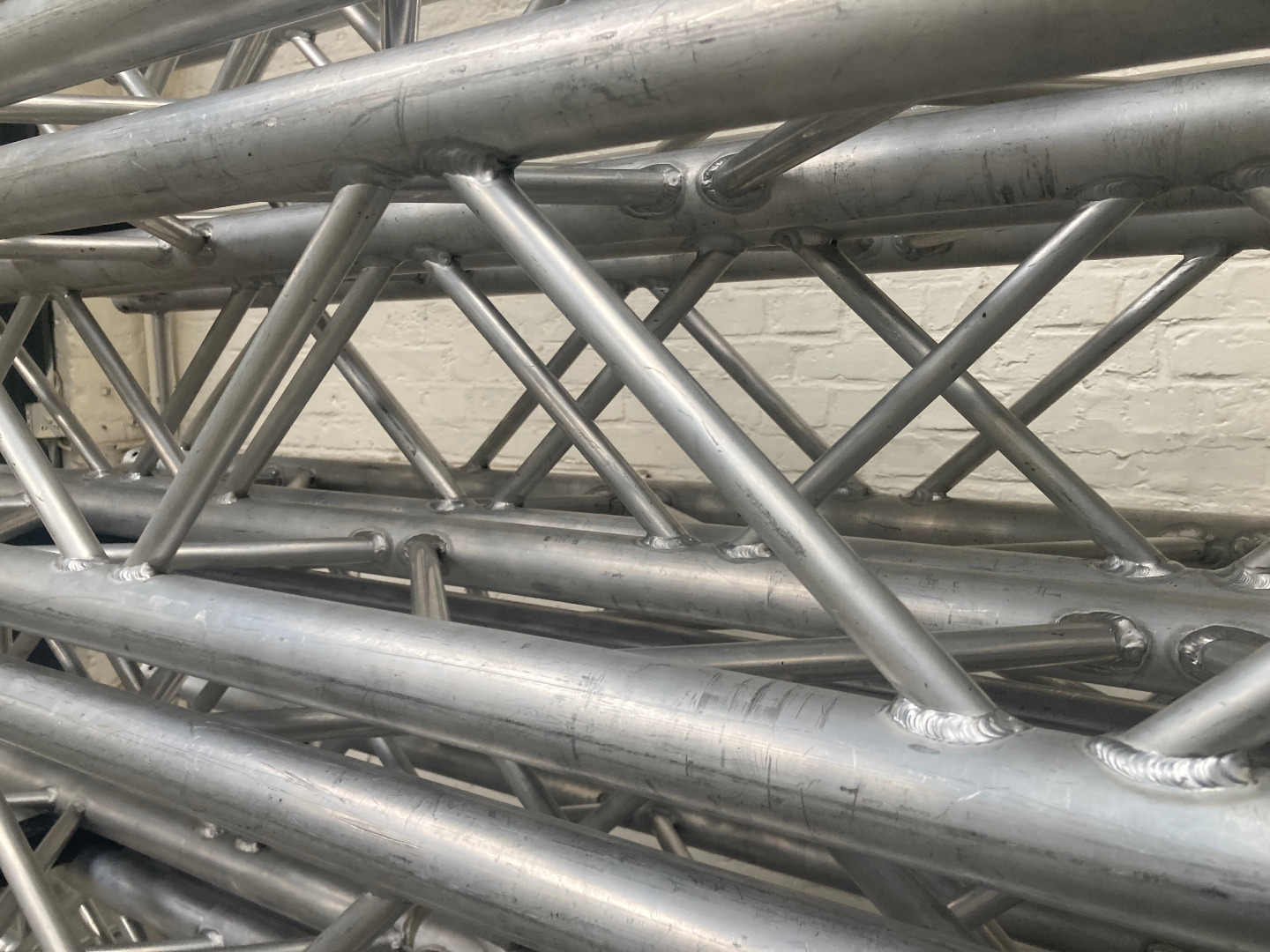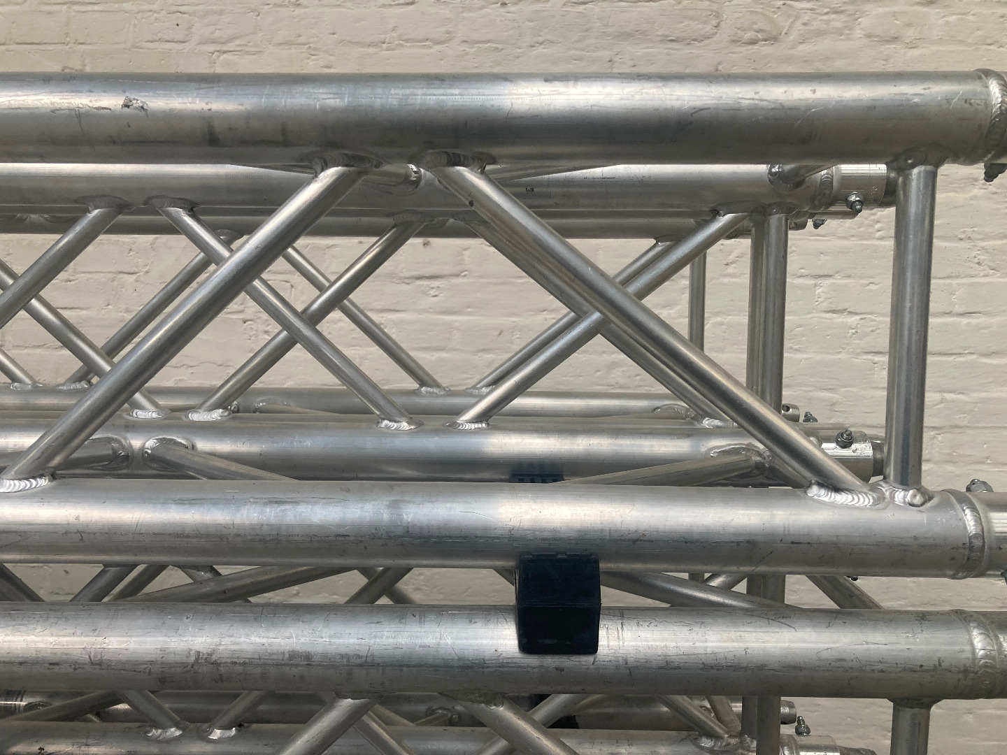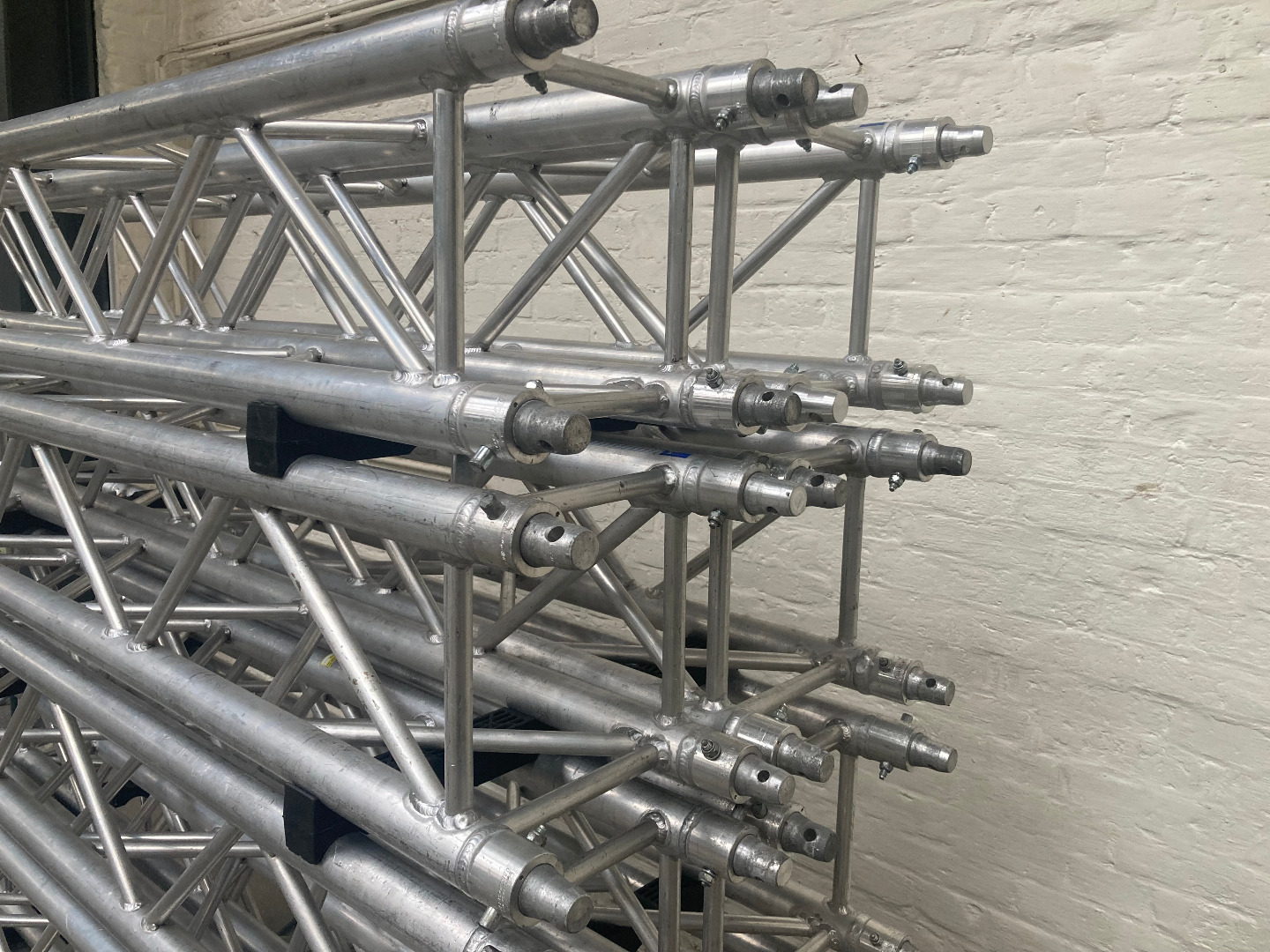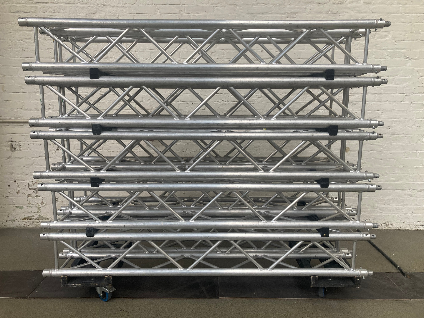 Solide 4-Punkt-Aluminiumtraverse des Typs Eurotruss FD34, ideal für Messe-, Bühnen- und Veranstaltungstechnik. Mit einem Maß von 290 × 290 mm, Hauptrohr 50 × 2 mm und Streben 20 × 2 mm bietet sie hohe Stabilität bei geringem Eigengewicht (ca. 6 kg/m). Hergestellt aus Aluminium EN AW-6082 T6, TÜV-geprüft und mit dem bewährten konischen CS1-Verbindungssystem ausgestattet. Gebraucht, aber in technisch einwandfreiem Zustand, sofort einsatzbereit.
