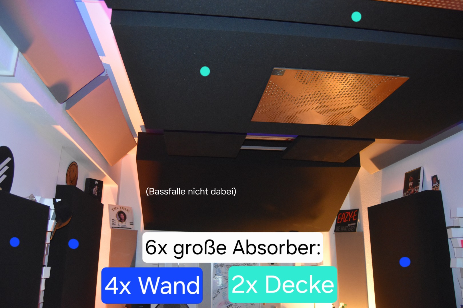 Die Absorber sind sehr hochwertig und stabil aus Holz hergestellt worden und sind mit Steinwolle gefüllt. Mehr Qualität geht nicht. Alle Befestigungen für die Wände sind dabei. Kaufpreis für die Diffusoren und Absorber waren 3000 Euro. (Bassfalle über der Tür auf den Fotos ist nicht dabei)