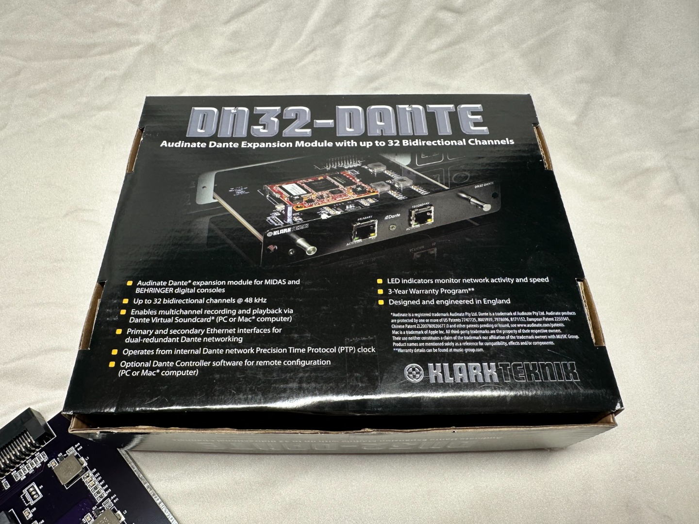 Es handelt sich um eine Audinate Dante-Karte für Midas M32 oder Behringer X32. Sie ist in einem sehr guten Zustand und funktioniert einwandfrei.