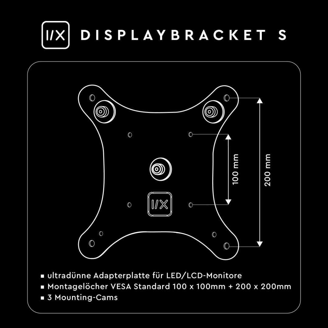 Ultradünne Adapterplatte zur Montage an LED/LCD-Monitore. Die Montagelöcher sind im VESA-Standard 100 x 100mm + 200 x 200mm. Mit den 3 mitgelieferten und vormontierten Mounting-Cams kann der Monitor schnell und einfach an unsere Floorstands oder kompatiblen Highstands anderer Hersteller eingehängt werden.