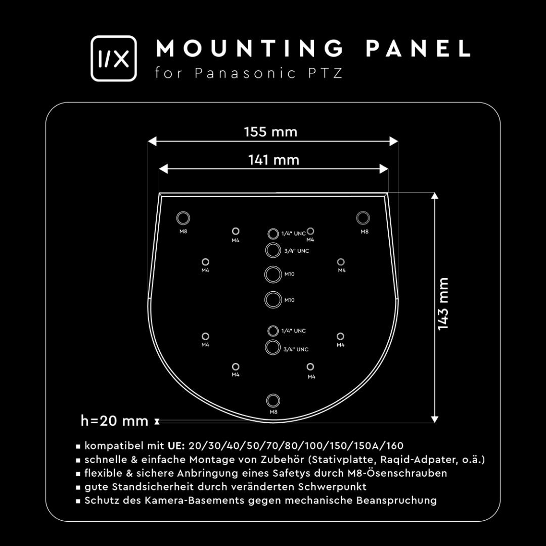 Das universelle I/X Mounting Panel ermöglicht eine schnelle, einfache und sichere Anbringung der Panasonic UE-PTZ-Kameras, die nahezu allen Anwendungsanforderungen bei Veranstaltungen und im Studio gerecht wird. Neben einer sicheren Standfläche bei gestellten Anwendungen bietet das I/X Mounting Panel einen guten Schutz am Boden der Kamera. Für den geflogenen Einsatz haben wir diverse Gewinde (M8, M10, 3/8″, 1/4″) für die Montage und Sicherung über Kopf eingearbeitet. Alles natürlich übersichtlich Beschriftet und in dezentem Schwarz.