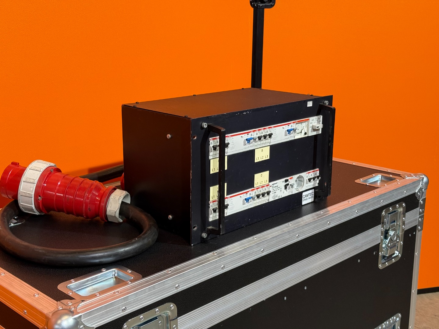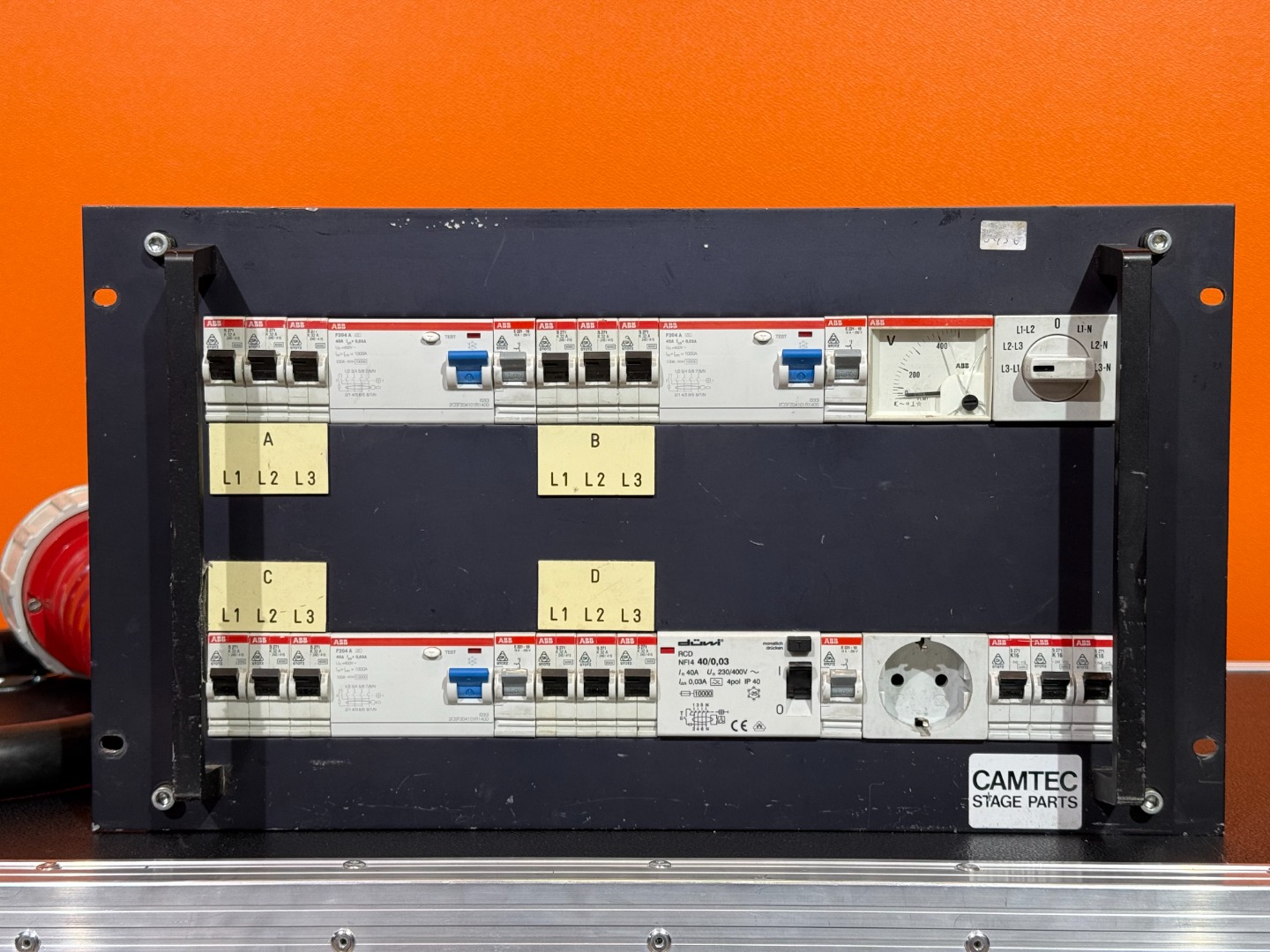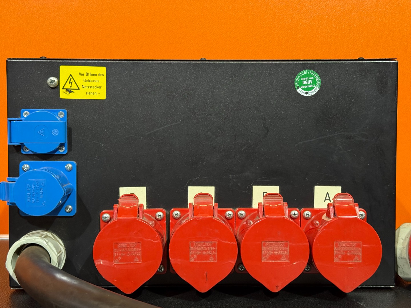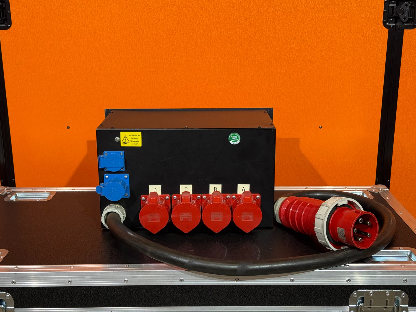 Out: 4x 32A CEE, 1x 16A CEE blau, 2x Schuko