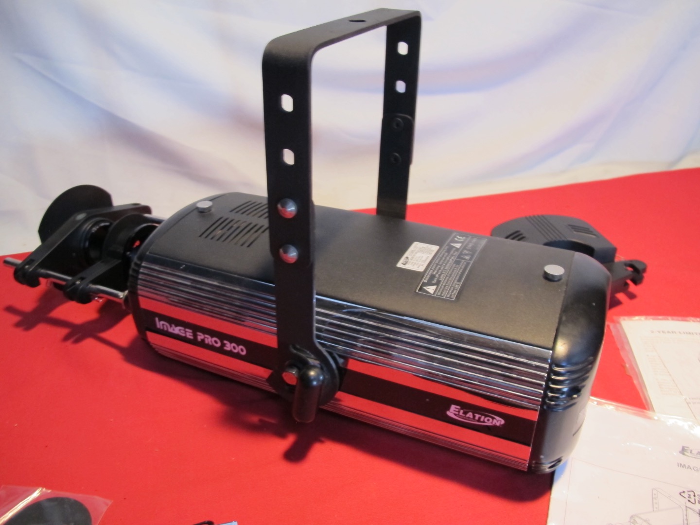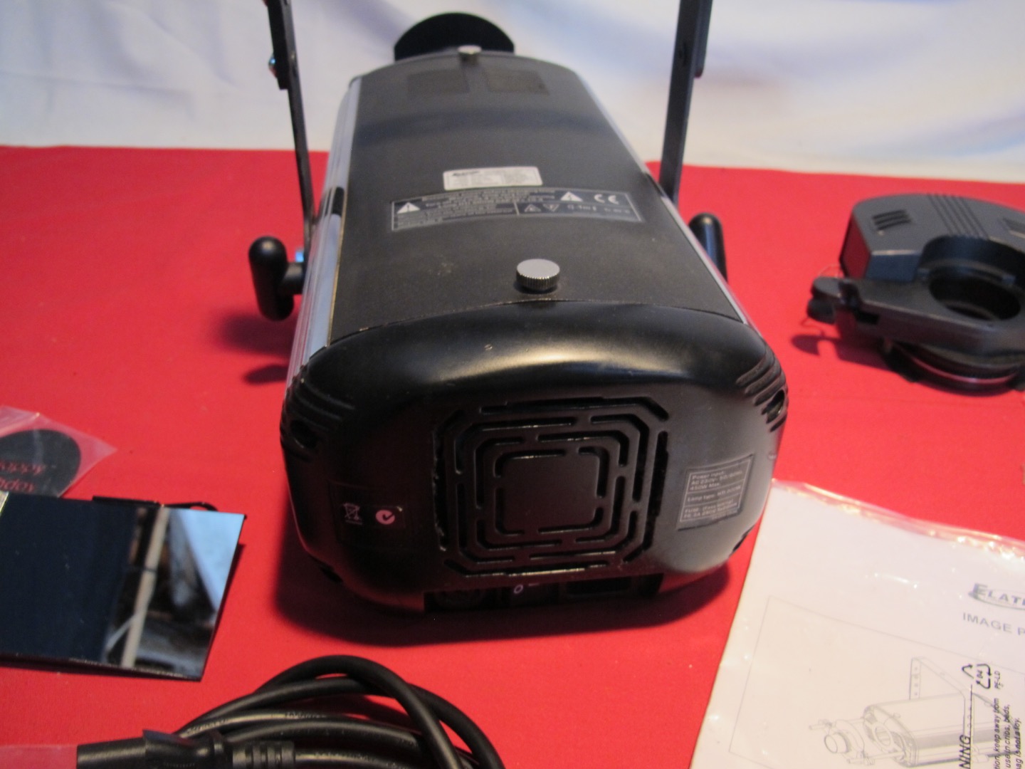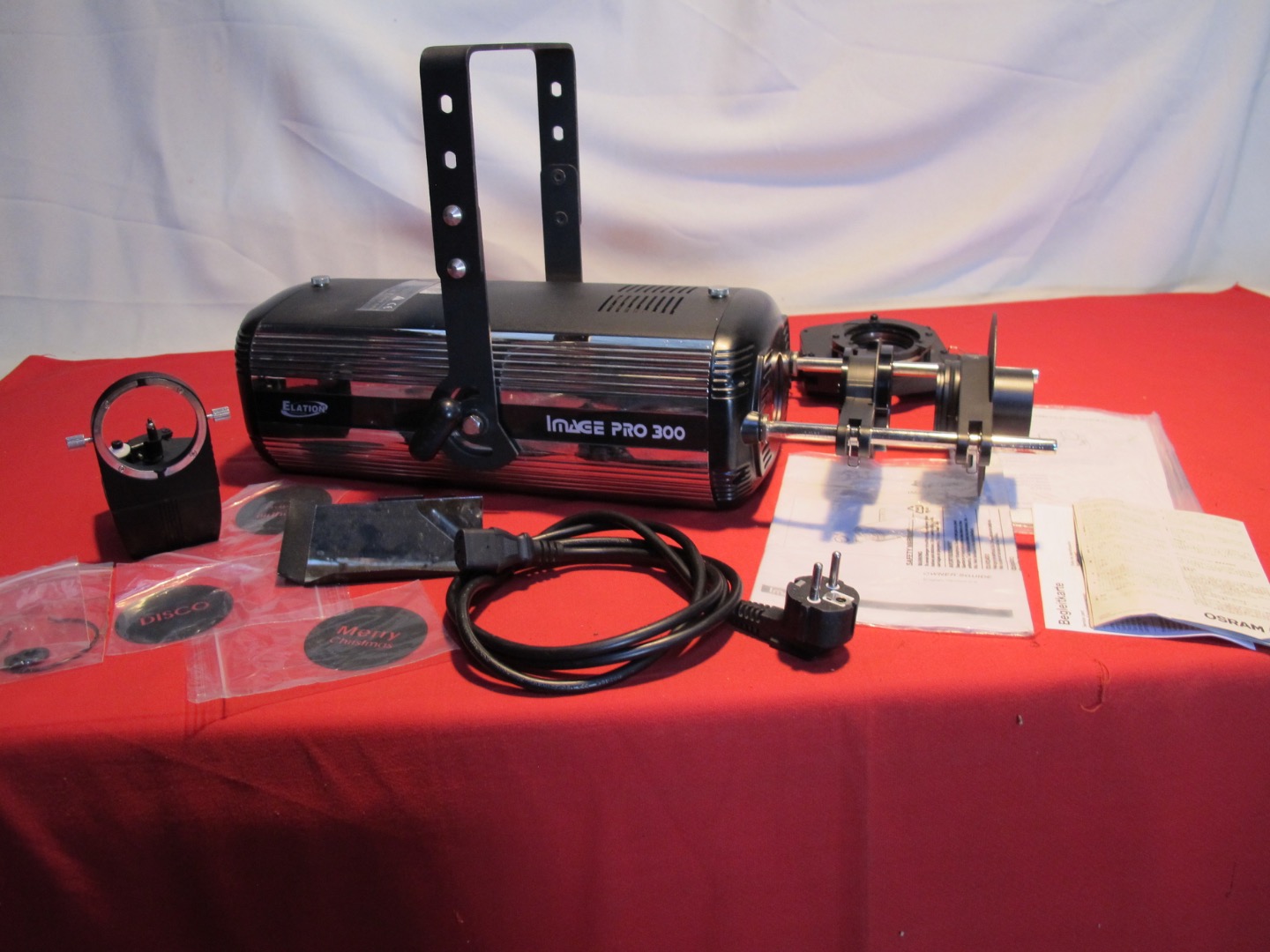 enthalten sind die originalen Unterlagen, eine erst kürzlich gewechseltes HTI Leuchtmittel, ein Power Cable, 4 Metall Gobos (Happy Birthday, Merry Christmas, Disco), ein Gobo Vorsatz IP-2, ein IP-3, ein IP-RP. Es können sowohl aufgrund der Wechseleinheiten Metall Gobos als auch farbige Glas Gobos projeziert werden. Der Projektor wurde selten genutzt und ist daher in sehr gutem Zustand. Er kann sofort eingesetzt werden. Der Gobo Projektor hat ein starkes HTI 300 Watt Leuchtmittel eingebaut und macht ein tolles Projektionsergebnis.