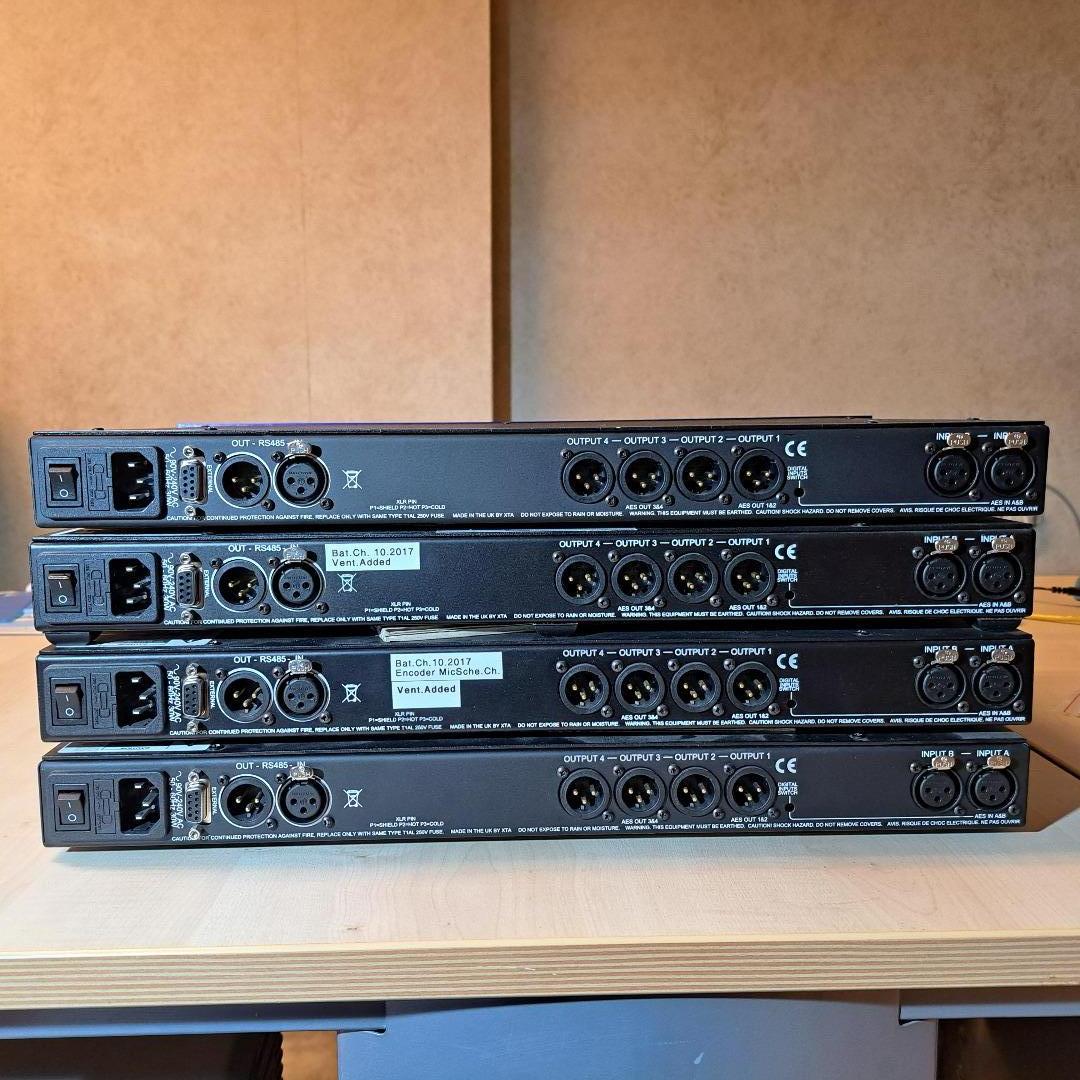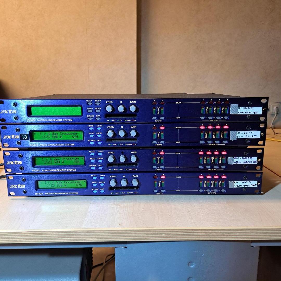 The XTA DP424 is a 2-input, 4-output digital audio management system with a dynamic range of over 116dB, a 96kHz sampling rate, and a 32kHz maximum frequency response. Key features include 28-band graphic and 8-band parametric equalizers on each input, up to 9 parametric equalizers on each output, various crossover filter options, a maximum delay of 650ms, and built-in AES/EBU digital interfaces.
