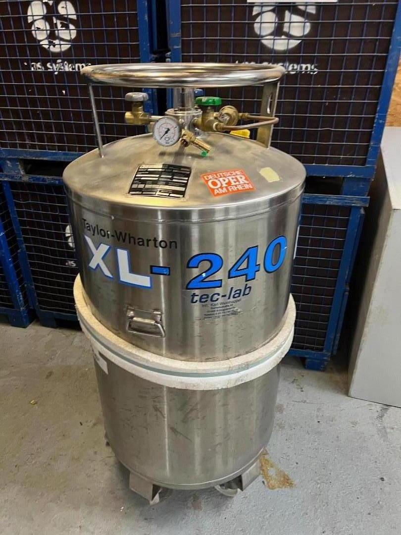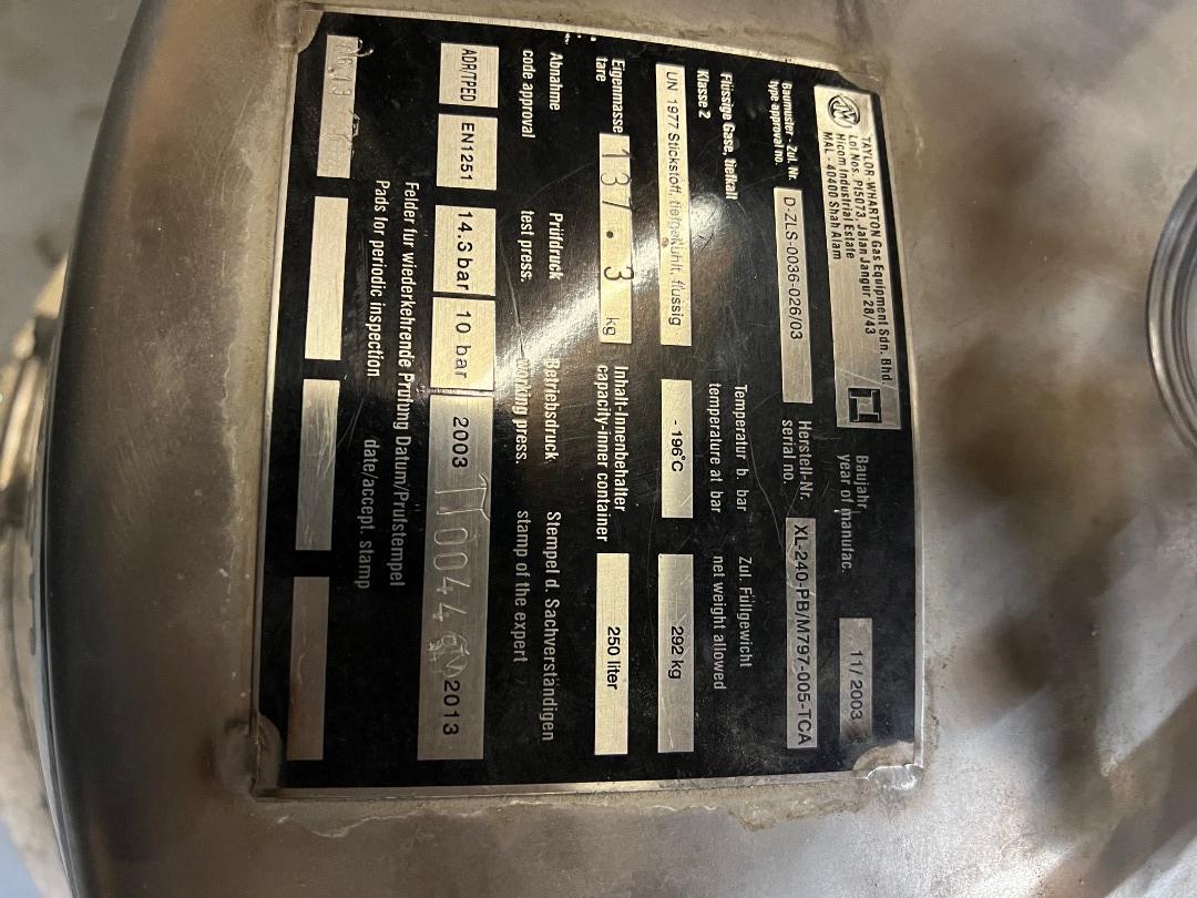 Tank Edelstahl für Flüssigstickstoff zur Herstellung von Bodennebel in Verbindung mit einer Bodennebelmaschine. Tank in einwandfreiem Zustand. Hergestellt 2003, wiederkehrende Prüfung erfolgte 2013, abgelaufen 2023; neue Prüfung ist problemlos möglich. Technische Angaben siehe Bild.