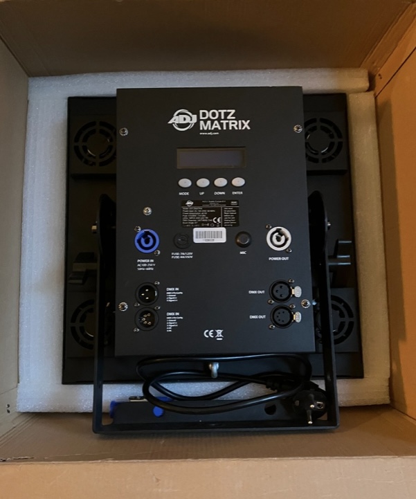 The fixture has many pro features such as: 0-100% electronic dimming, strobe/pulse effect, built-in shows and colors macros, a 4-button DMX LCD display, locking Power connector In/Out, 5 selectable Dim Curves for stage lighting, 4 Pixel Flipping options, and 5 DMX channel modes. Dotz Matrix may run in its stand-alone mode from built-in programs, sound actively or from a DMX Controller.