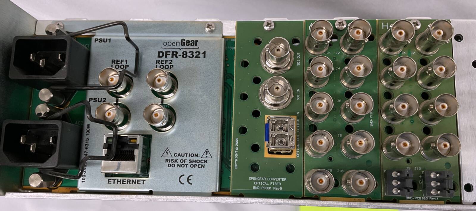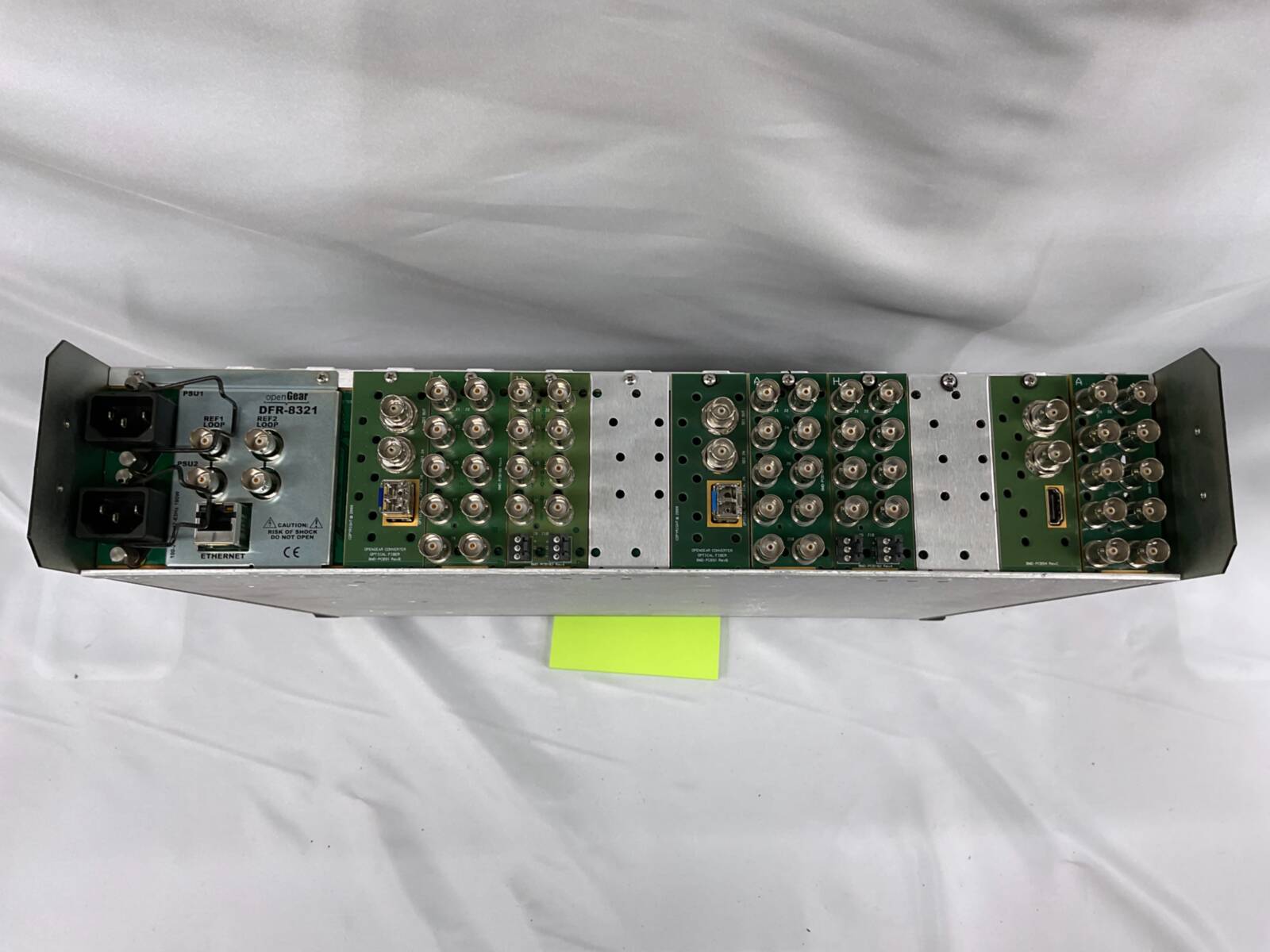 Versatile frame featuring dual power supply units designed for converting SDI signals to analog, analog to SDI, SDI to HDMI, SDI splitting, and SDI to fiber and back conversions. Suitable for professional video signal routing and format adaptation in broadcasting or event setups.