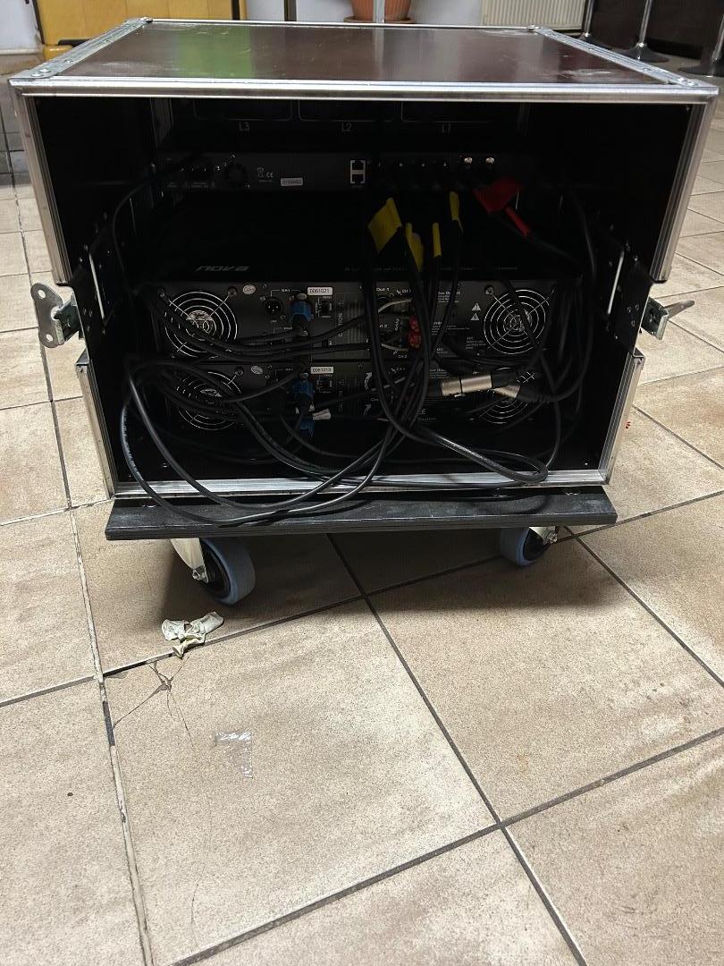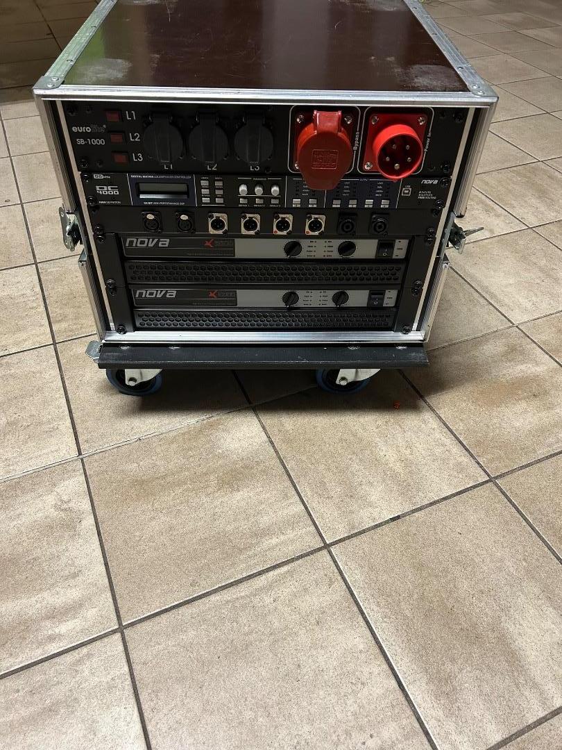 2xX2000 Verstärker verbaut im Rack auf Rädern mit Stromverteiler“Eurolight SB-1000“, 4polig verdrahtet