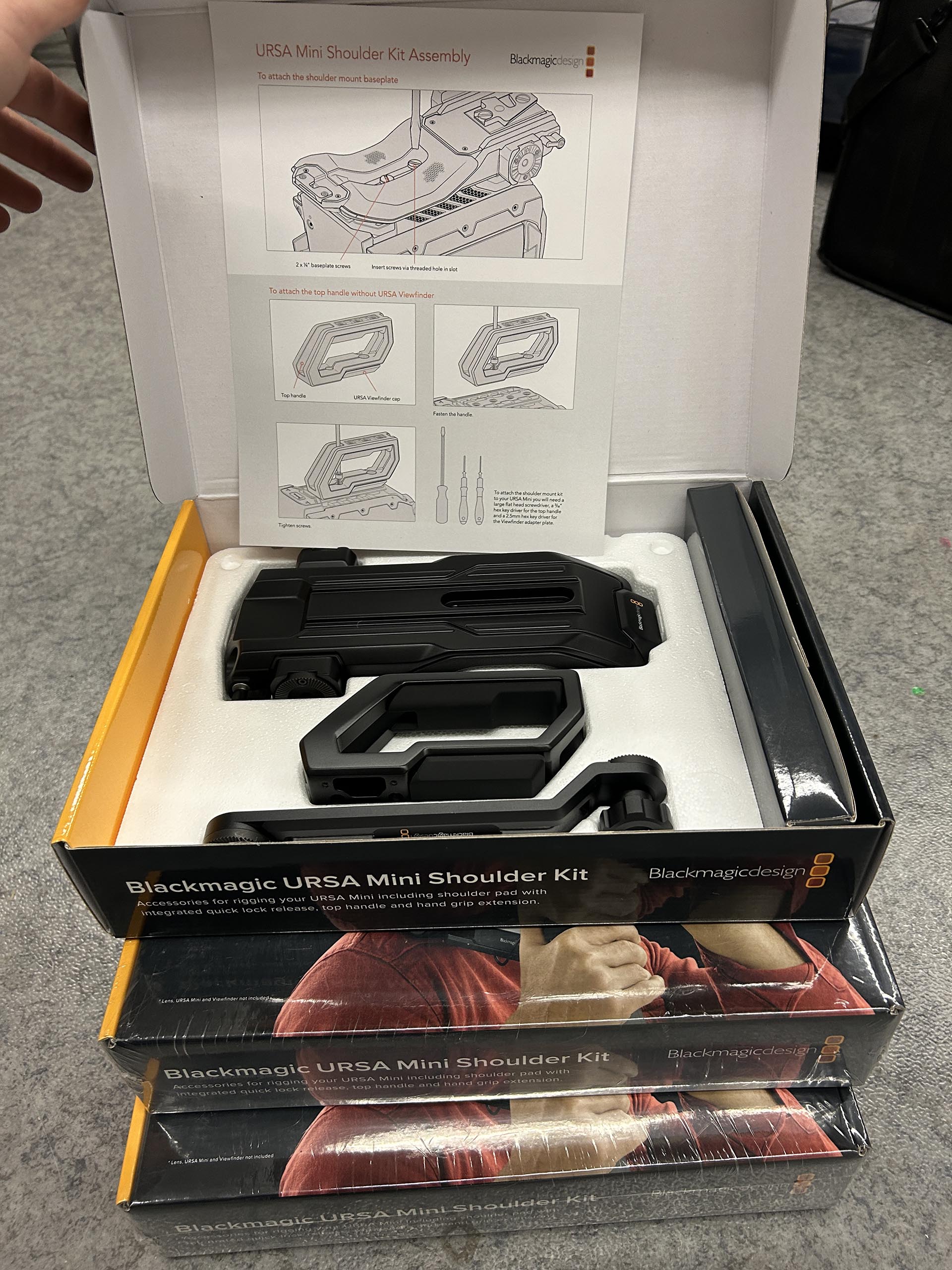 Set of three shoulder kits designed for compatibility with Blackmagic URSA Mini cameras, each unit supplied in its original packaging.