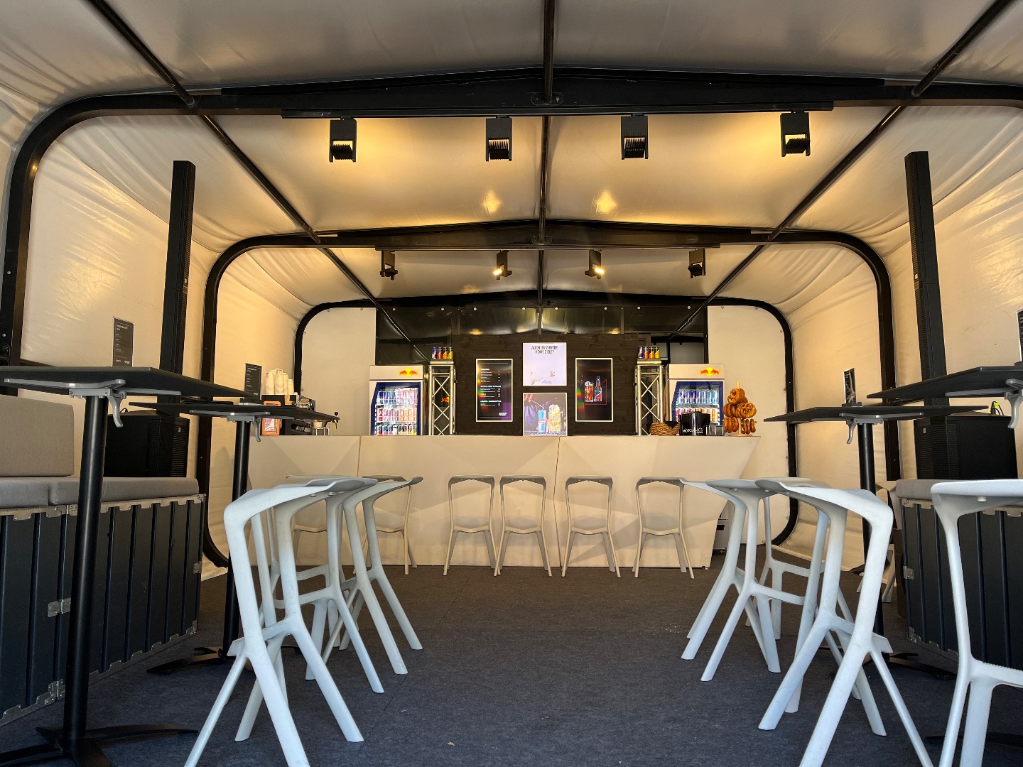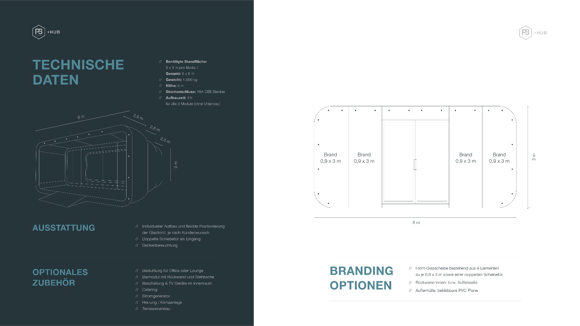 Die nutzbare Fläche liegt je nach Aufbau zwischen 15 und 45 m2. Die Glasfront wirkt einladend und kann außerdem individuell gebrandet werden.