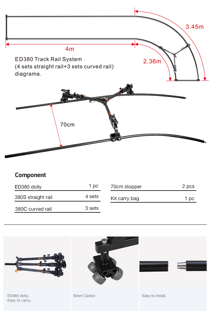 Includes multiple straight and curved rail pipes with matching inner and outer diameters, a dolly, end stoppers, and a convenient carry bag, suitable for flexible stage transport setups and easy mobility on stage.