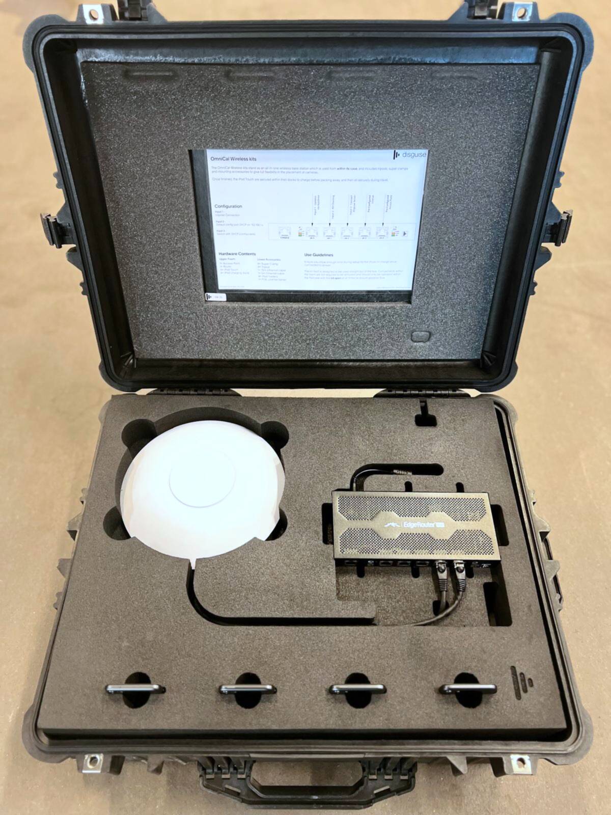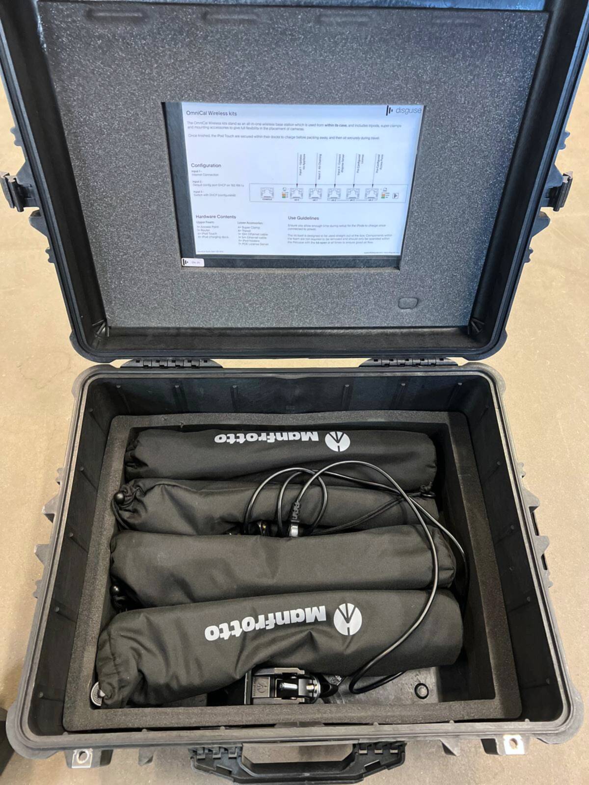 Comprehensive wireless calibration kit featuring four iPod touch devices, a wireless base station, complete charging solutions, tripods, super clamps, and mounting accessories for seamless system setup and operation.