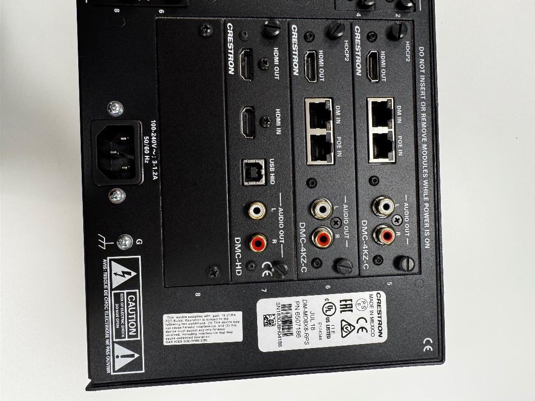 The Crestron DM-MD8X8-RPS Digital Media Matrix Switcher is in very good used condition (see pictures). It is ideally suited for larger AV setups. Its modular design allows for flexible expansion, and the redundant power supply ensures stable operation even during extended use. The device has not exhibited any defects during operation. Switching between audio and video signals is very fast, and HD content is distributed without any loss of quality. It supports almost all common formats. Integrated features include comprehensive HDCP and EDID management, CEC signal passthrough, USB routing, an integrated Ethernet switch, and simultaneous output of 7.1 and stereo audio. H.264 streaming is also supported, making the switcher a flexible solution for home theaters, studios, or professional installations. Unfortunately, the original packaging and manufacturer's manual are not available. A power cable is included.