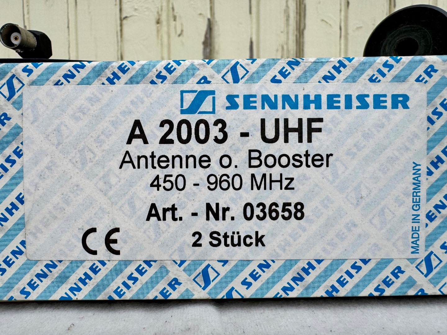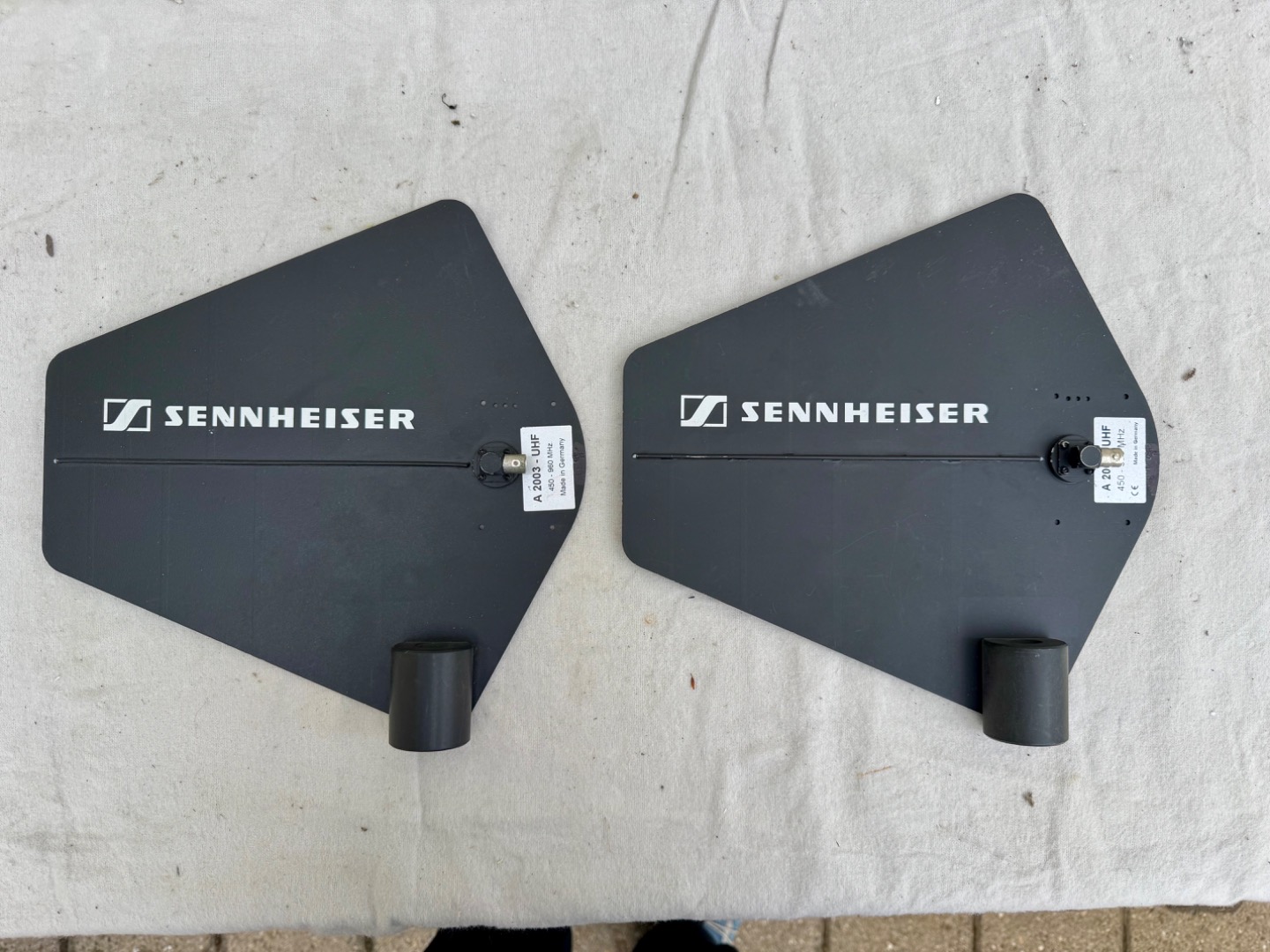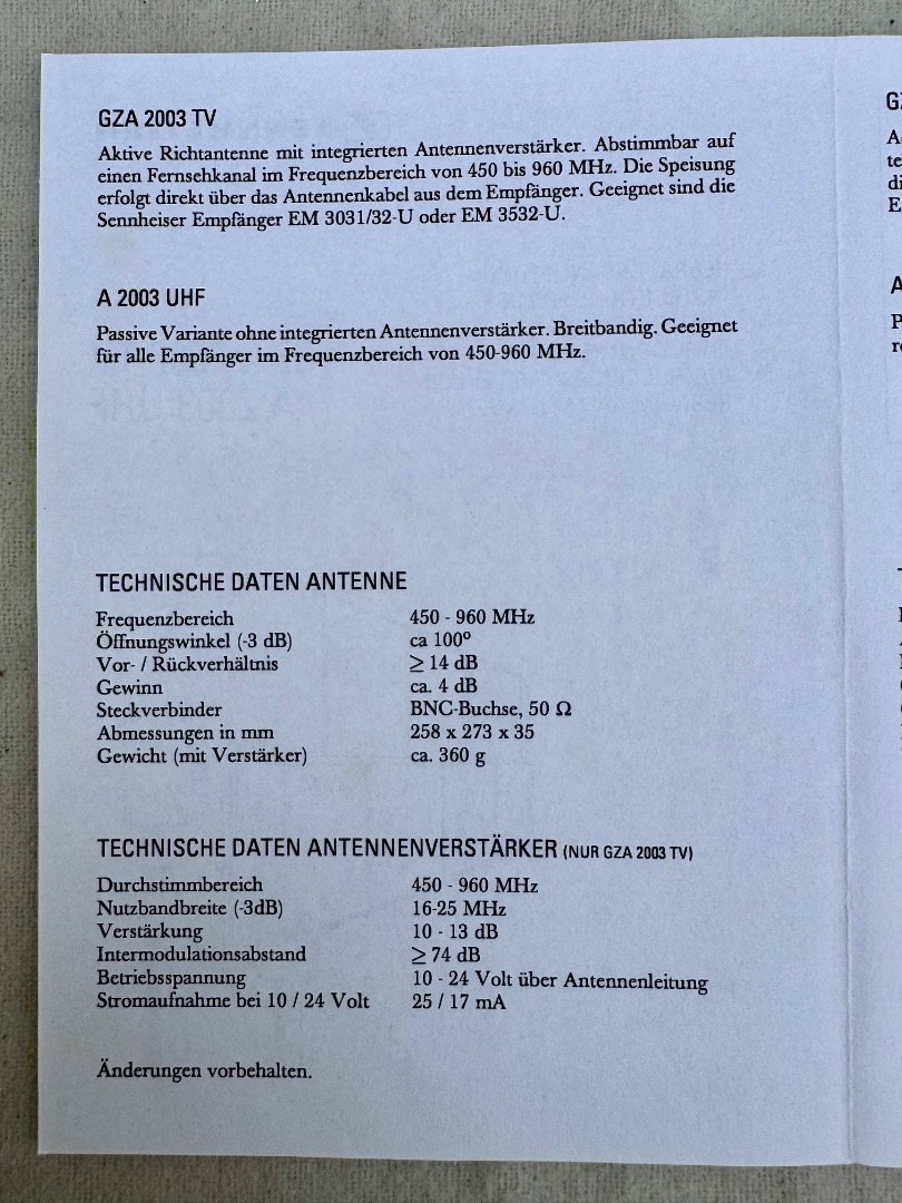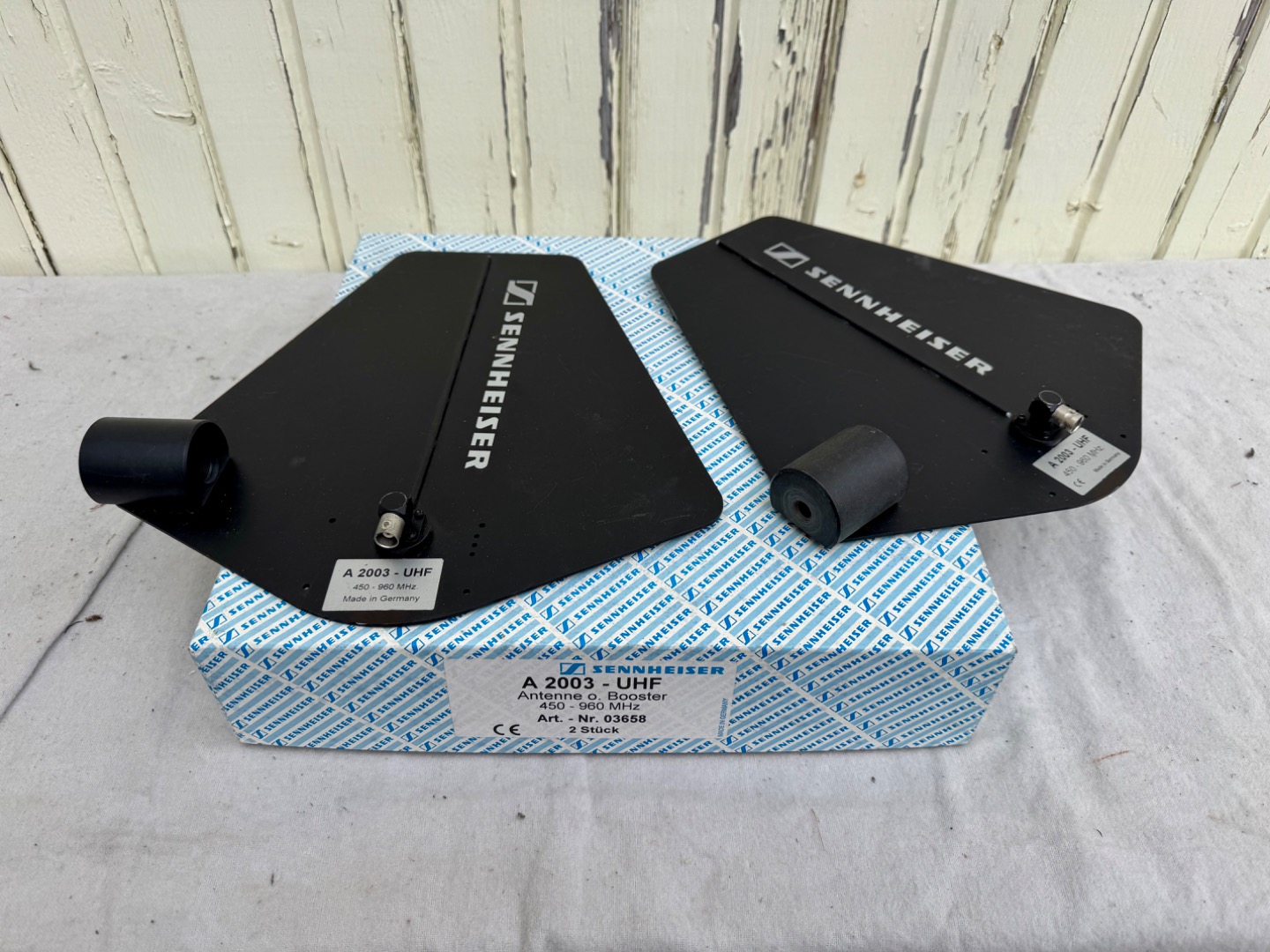 Verkaufe 1 Paar / 2 Stück Sennheiser A 2003 UHF Antennen, ohne Booster, 450 - 960 MHz, Öffnungswinkel ca. 100 Grad, 3/8" Gewinde für Micro-Stativ, im original Karton, Anschluss BNC, technischer und optischer Zustand gut (Siehe Bilder).
