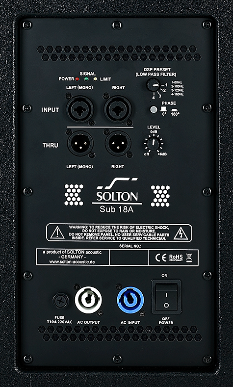 Active Tuning / Features: Volume, Variable crossover 80 – 200 Hz, Phase switch