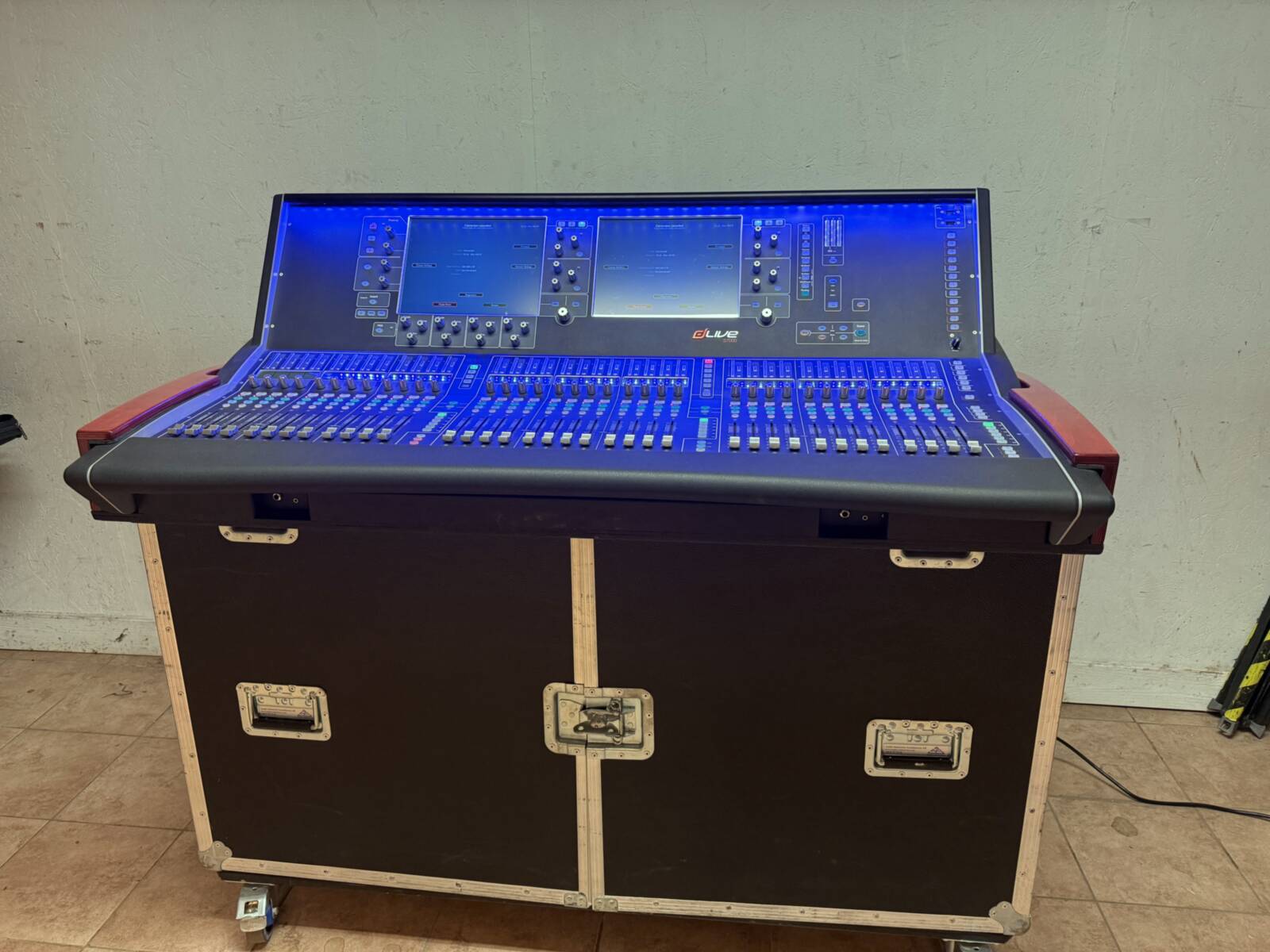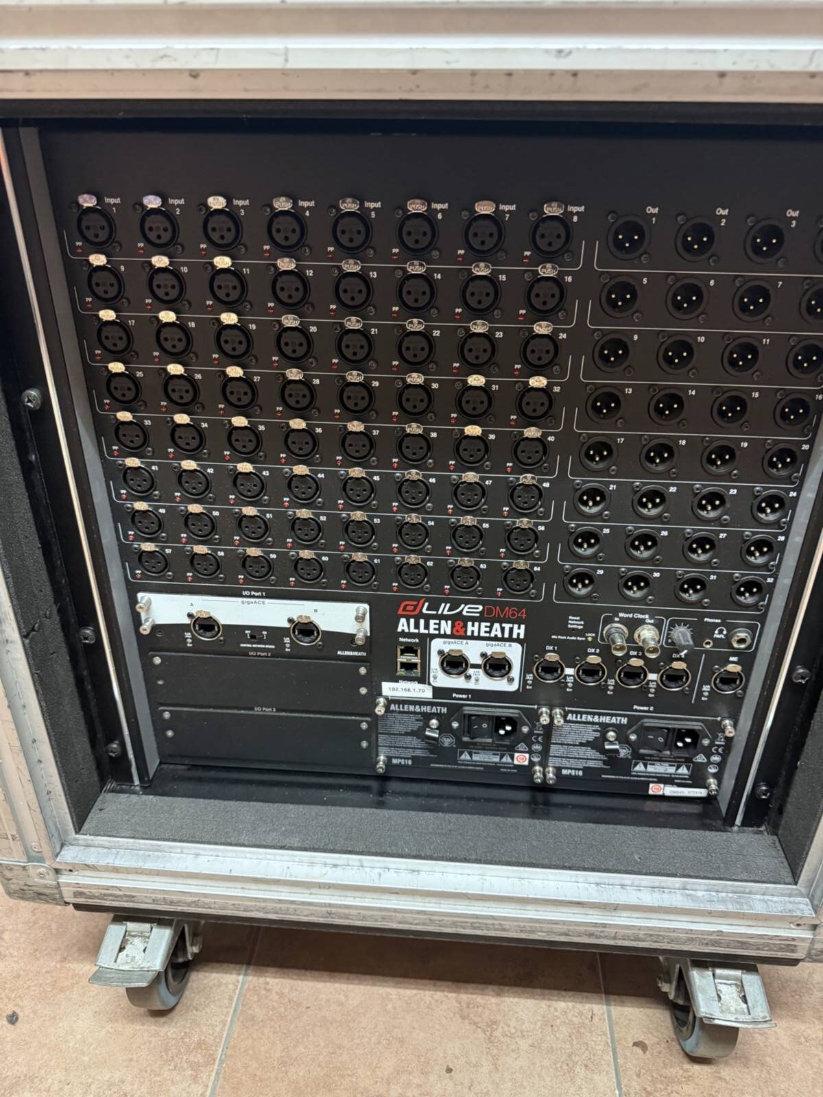 Allen & Heath S7000 digital mixing console housed in a flip case, accompanied by an Allen & Heath DM64 stage box featuring a GigaAce card, all securely stored in protective cases. Designed for robust professional audio applications where advanced digital mixing and versatile connectivity are essential.
