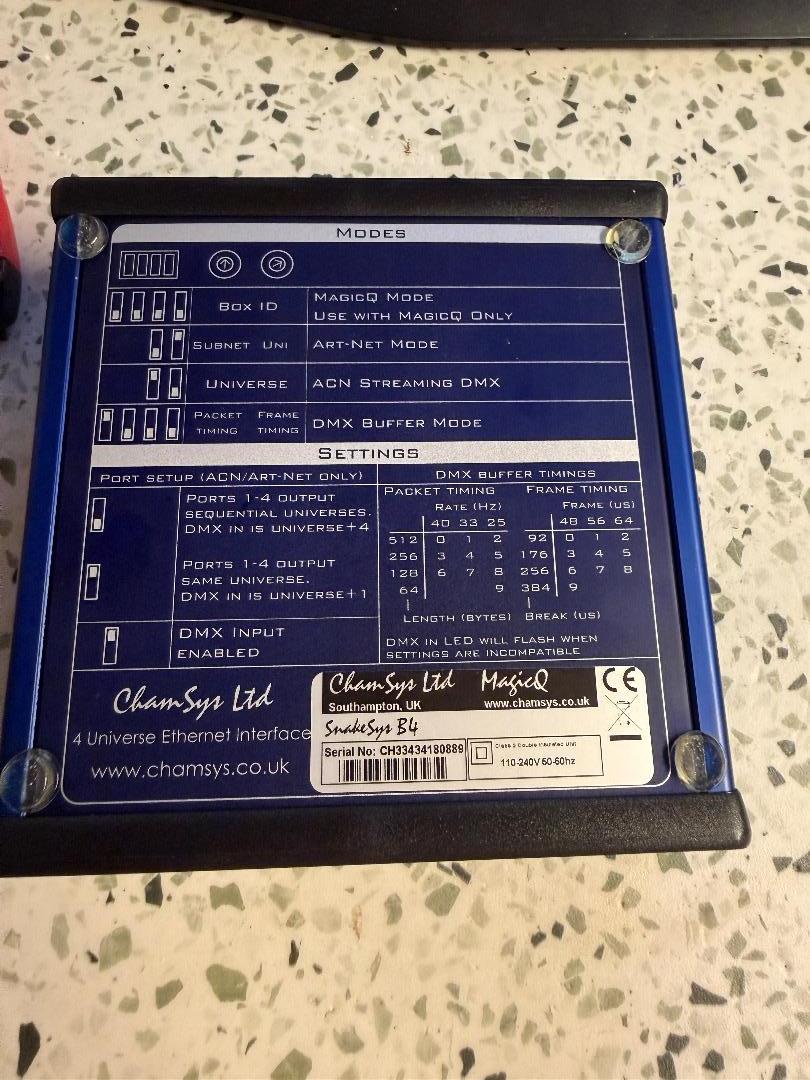 Verkaufe mein fast neues Chamsys SnakeSys B4 mit 4 Universen da ich auf ein MQ Pult umsteigen will das Interface wurde sehr wenig bis gar nicht genutzt somit lag es nur herum bei mir zuhause Versand möglich Versandkosten trägt der Käufer