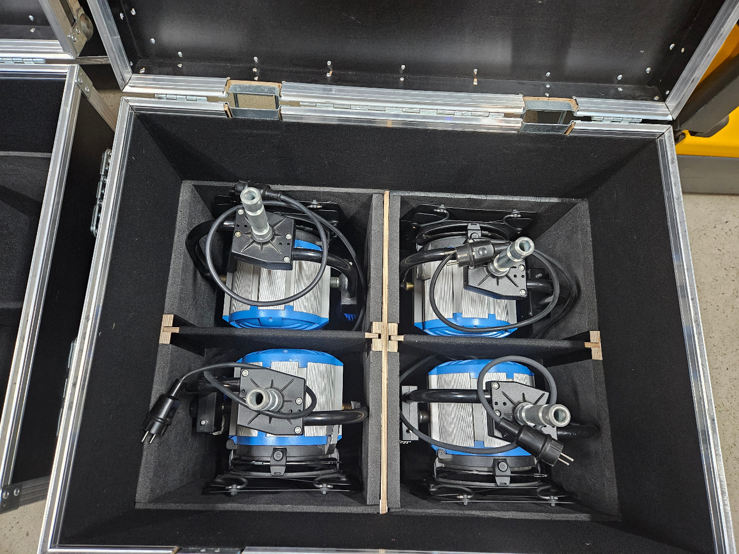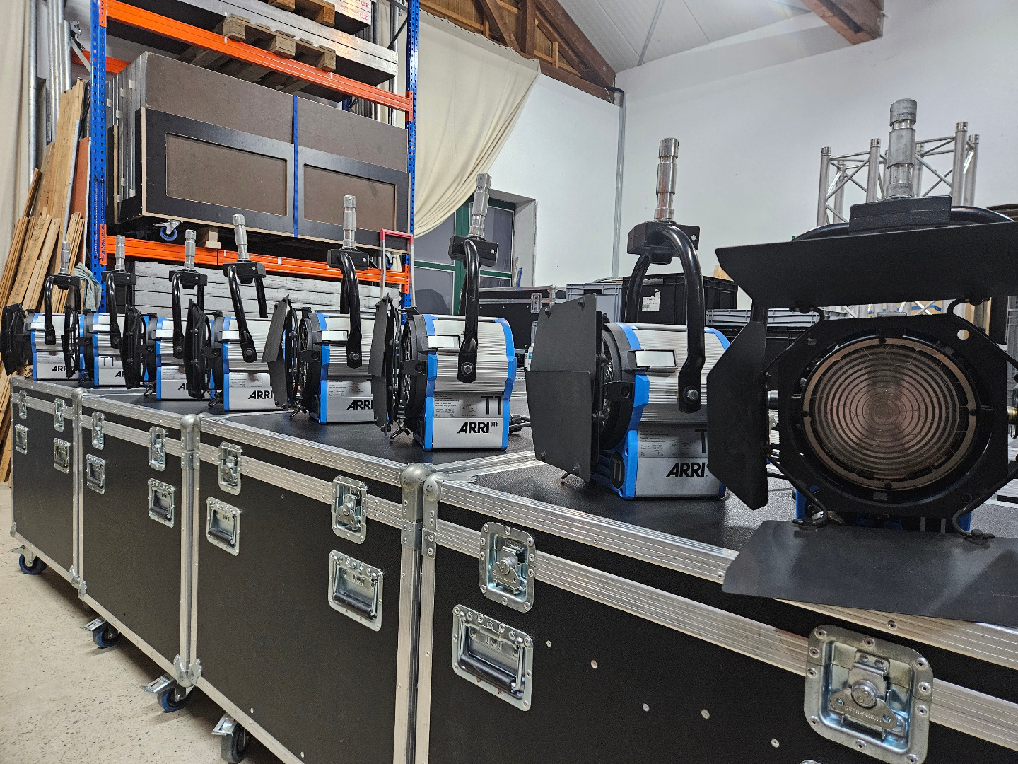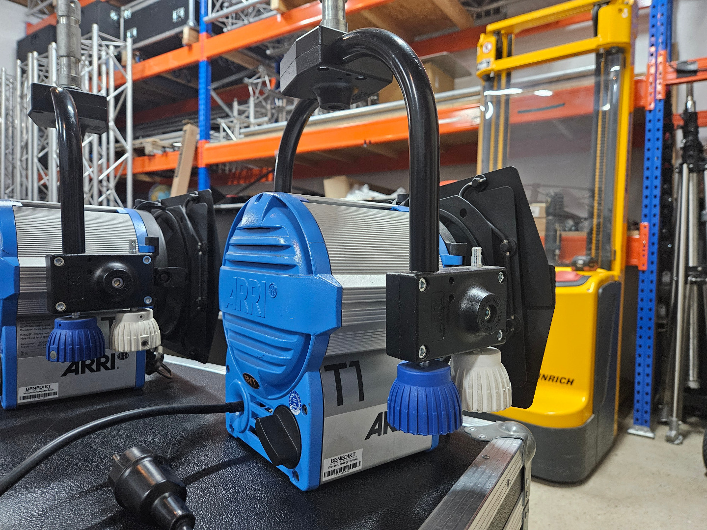 Verkauft werden bis zu 8 Arri T1 mit einer Leistung von 1000W. Alle Lampen sind Stangenbedienbar und für ihr Alter in einem sehr guten Zustand. Bei lediglich 3 löst sich an manchen Stellen der blaue Lack (siehe Foto).