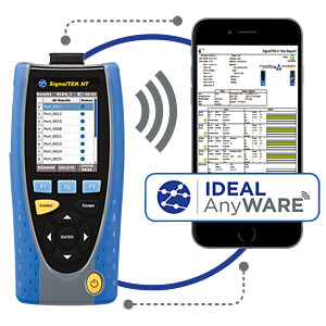 SignalTEK NT ist ein handlicher Transmission-Tester mit kapazitivem Touchscreen zum Nachweis der korrekten Installation von Kupfer- und Glasfaserkabeln mit Unterstützung von Sprach-, Video-, Daten- CCTV-Anwendungen über 10/100-Megabit- und Gigabit-Ethernet. Das Handgerät ist mit vielen Funktionen zur Fehlerdiagnose in Netzwerken, wie Verdrahtungstest pro Pin/Paar, Längenmessung mit TDR-Technologie, Tongenerator zur Kabelortung und Ethernet-Verbindungsprüfungen ausgestattet. Der Datenspeicher nimmt bis zu 5.000 Tests auf und die Testberichte können in 3 Versionen dargestellt werden und im neuen übersichtlichen PDF-Format oder CSV schnell und einfach über WiFi und die AnyWARE App weitergegeben werden.