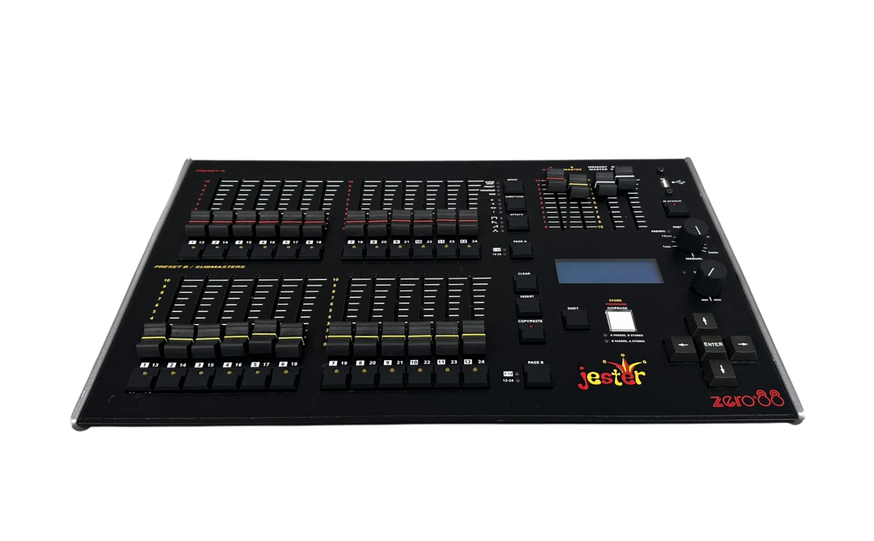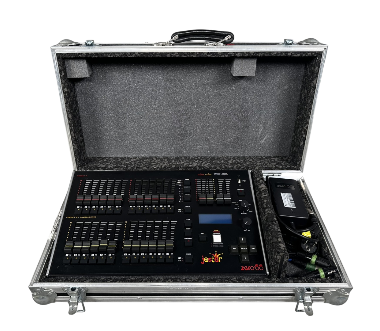 Zum Verkauf steht eine Zero 88 Jester 12/24 DMX Lichtkonsole inkl. Transport-Case.