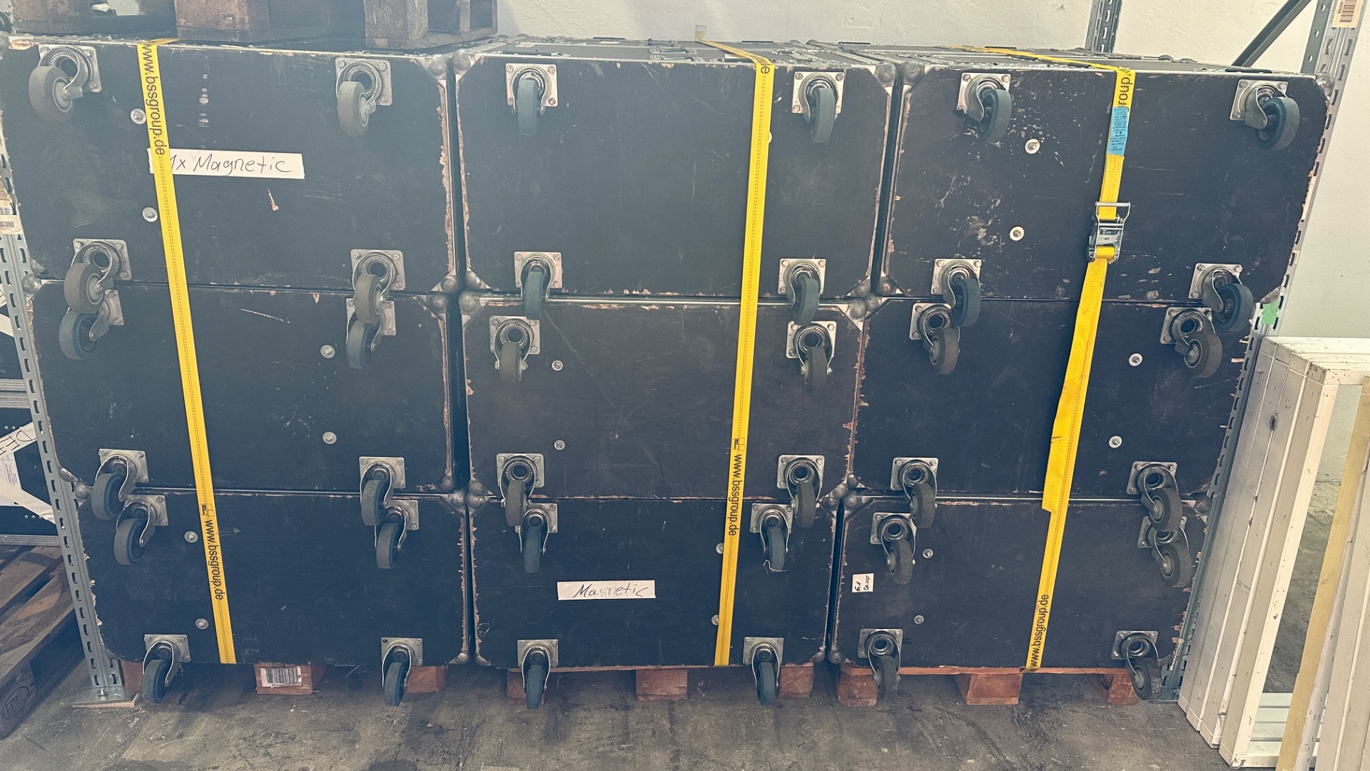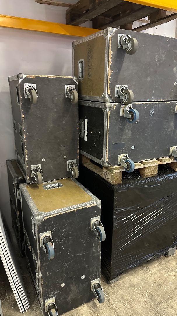 5 Paletten 1,5x1x2,10 m lxbxh (überbreite wegen abstehender Rollen der Cases)