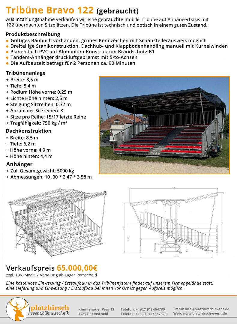 Die Tribüne ist einem guten technischen Allgemeinzustand und verfügt über ein gültiges Baubuch.