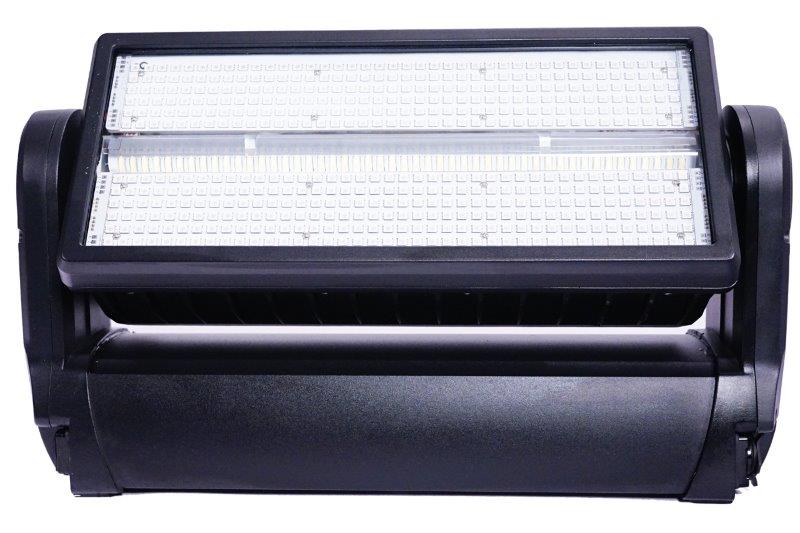 Extrem Leistungsstarkes Moving Strobe mit IP65 Klassifizierung. Es besitzt 480 LEDs RGB 3in1 in 8 Pixel-Abschnitten, 144 LEDs 5 Watt - 6500k weiß in 4 Pixel-Abschnitten, eine motorische Neigungsbewegung mit 185 Grad Schwenkwinkel. Des weiteren hat es LED-Makroeffekte, einen linearen 0-100% Dimmer, 0-20-Hz Strobe Effekte sowie einen P-Con True In- und Output. Leistung 1000W.