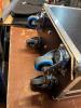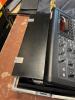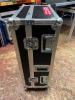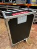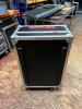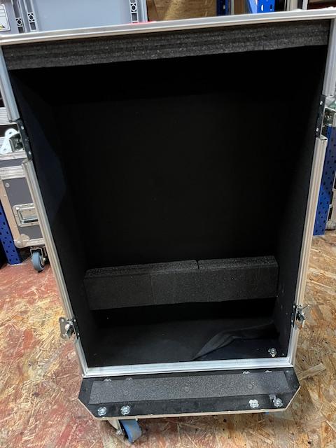 Stabiles Case mit 6 Griffen, Rollen, sodass die Haube hinter dem Pult stehen kann, ordentlich gepolstert, mit Dog-House für Steckdosenleiste und Router etc.