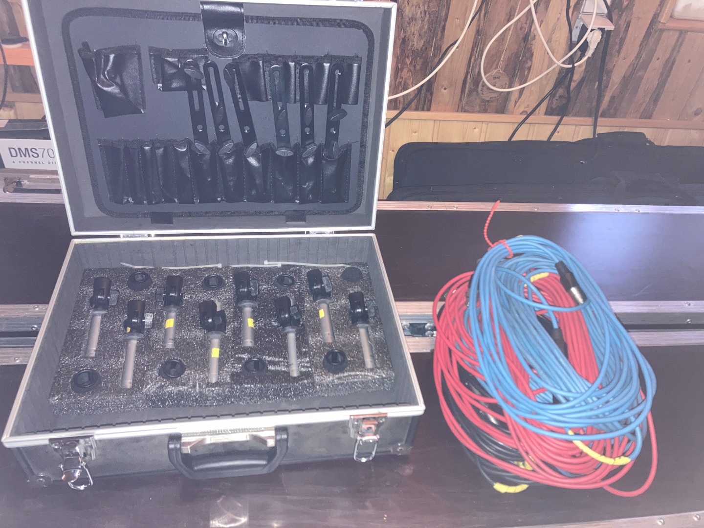 Set bestehend aus 8 Mikrofonen mit je einem Kabel und 5 Stativbrücken.