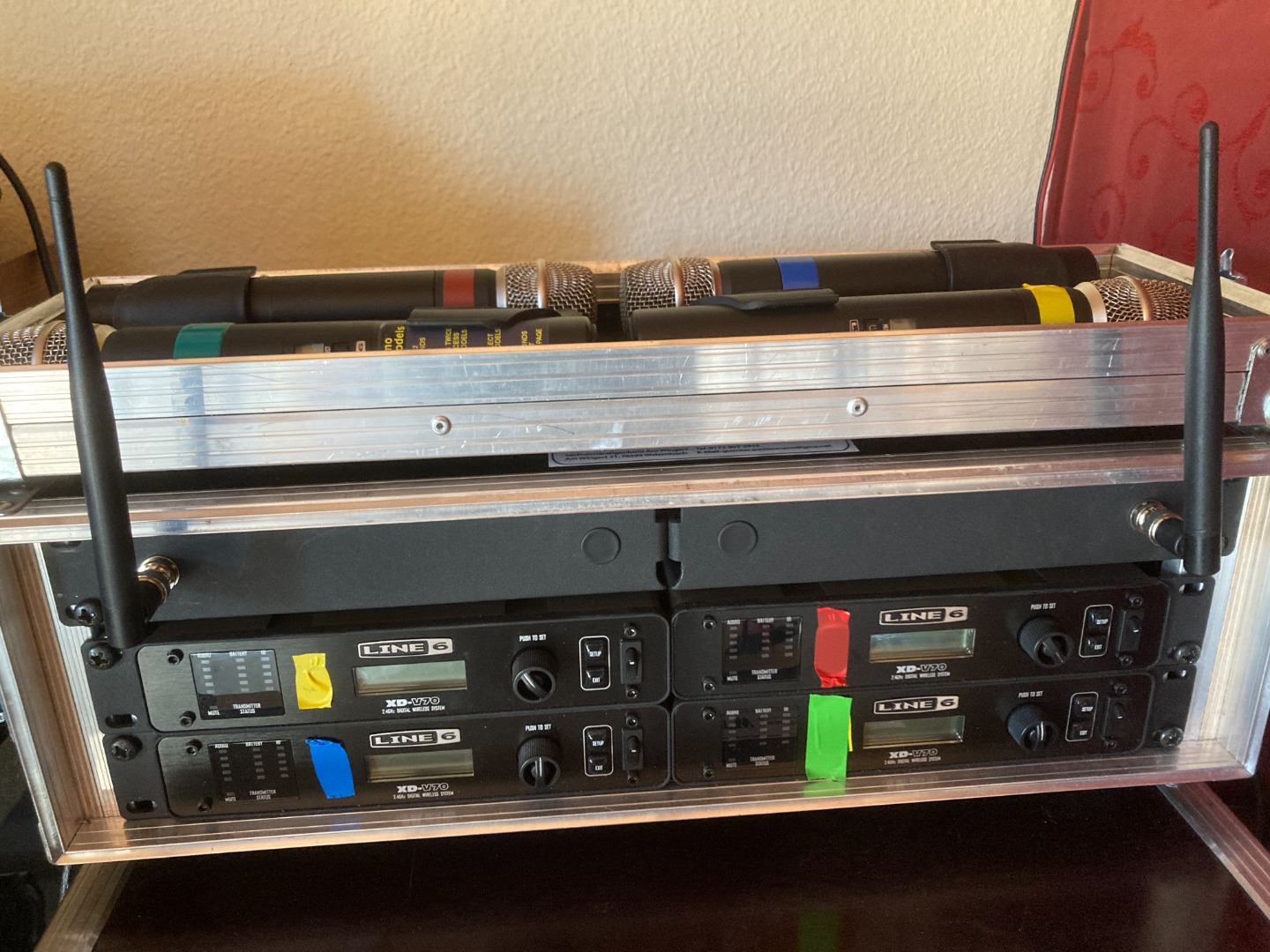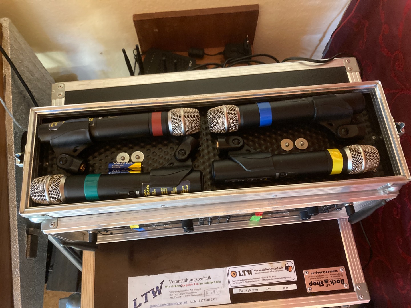 Set bestehend aus 4 Funk-Mikrofonen mit 4 zugehörigen Empfängern und 2 Antennencombinern. Ebenso ist das abgebildete Rack enthalten.