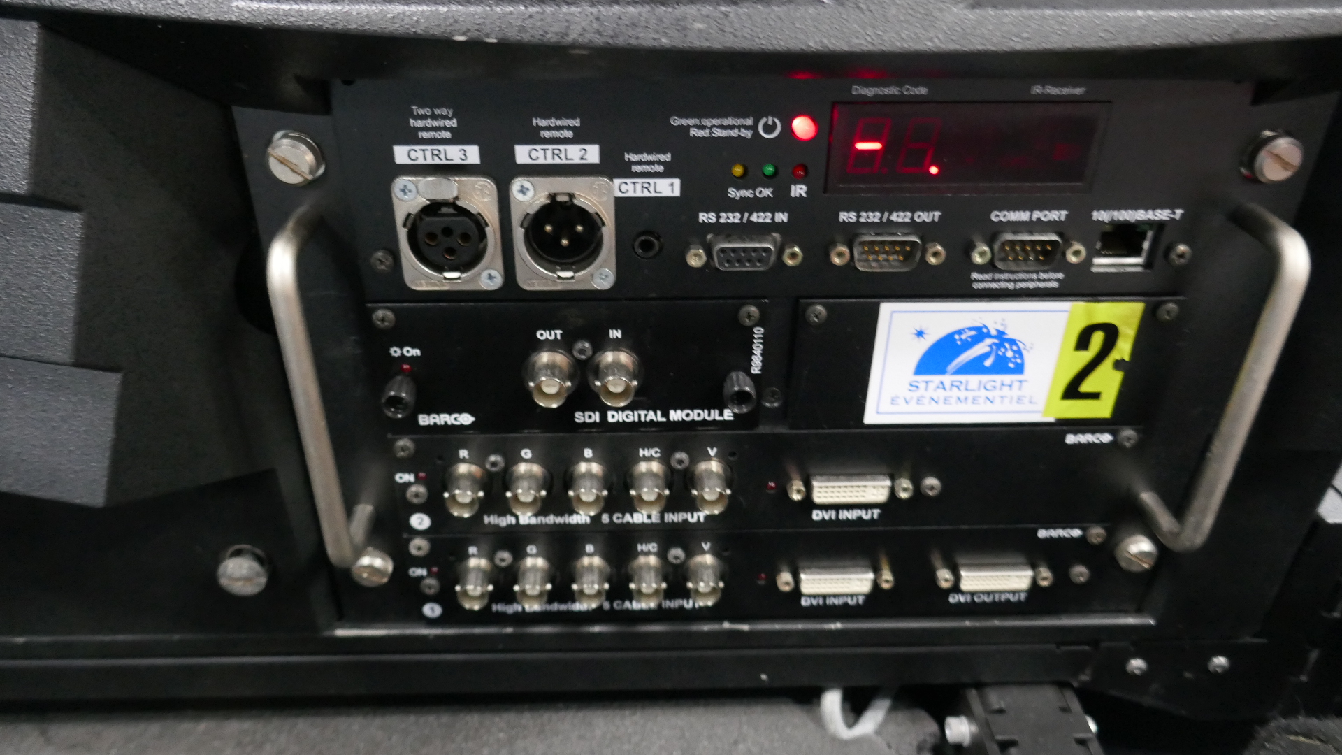 The Barco SLM R12+ Performer Projector is a SXGA+ Large Venue Projector. This lamp based projector is capable of displaying 13,500 Lumens at its brightest setting with a native resolution of 1400×1050 . The internal DLP technology touts higher contrast, less visible pixels and more portability. The unique projector lens has the ability to be shifted to allow greater flexibility in positioning the projector relative to the screen.