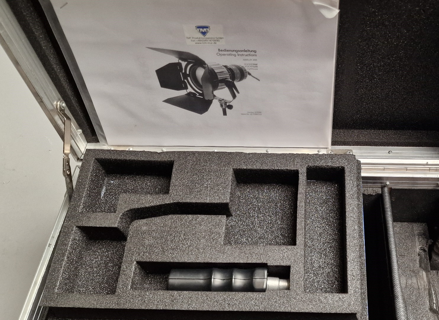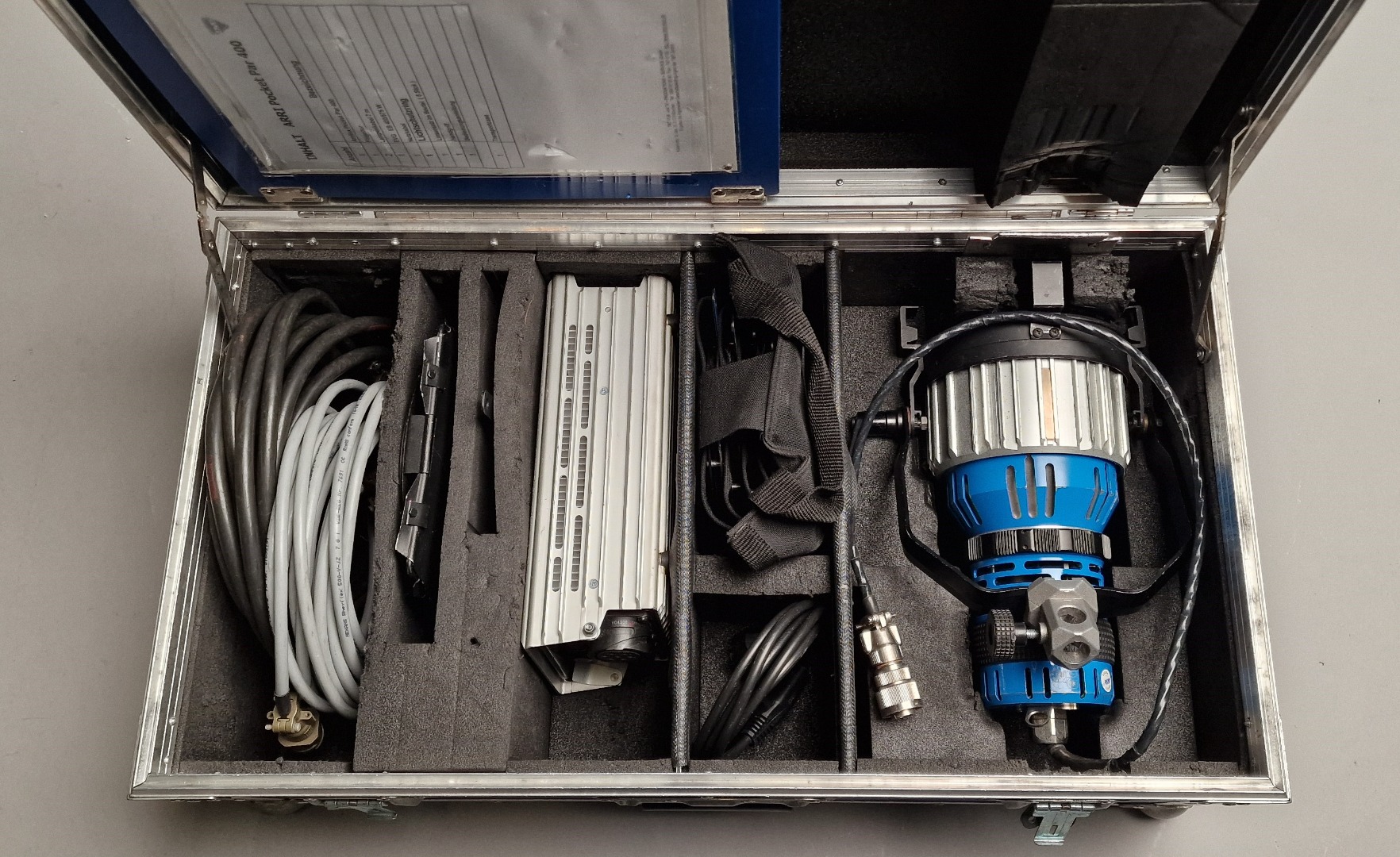 Dies ist ein 400 W Pocket Par Koffer Set mit einem Lampenkopf inkl Bügel mit 16 mm Aufnahme, einem Kombi Vorschaltgerät 400/575 W , einem Kaltgeräte Kabel, 2x Lampenkabel, einem 4-Flügel Tor, 5 verschiedenen Streulinsen und einem Haltegriff. Der Zustand ist gut mit Gebrauchsspuren aber ohne Einschränkung in der Funktionalität.