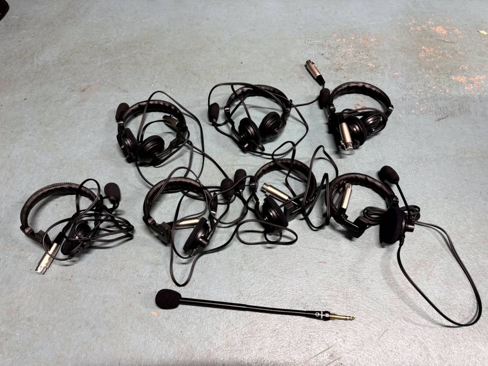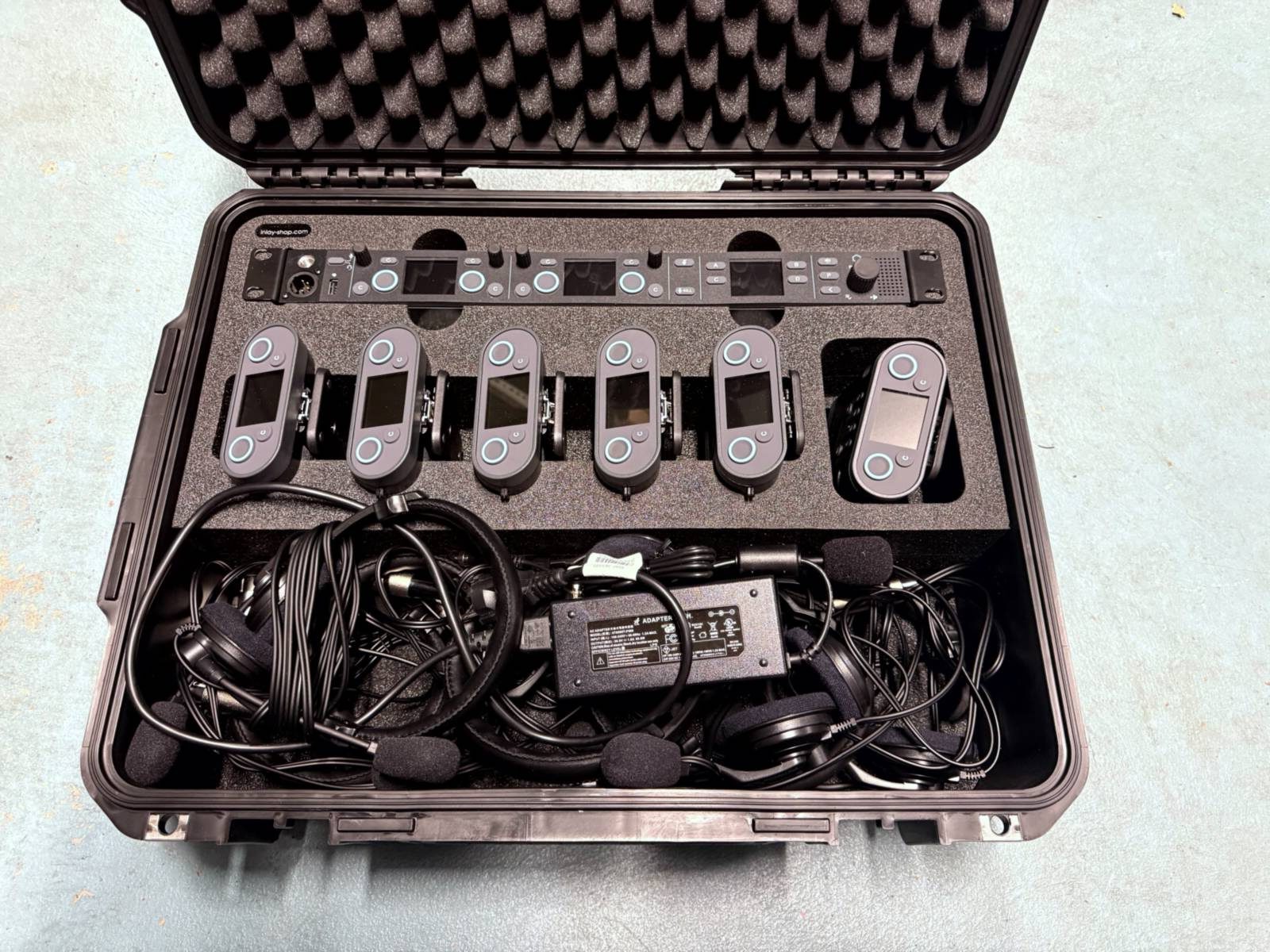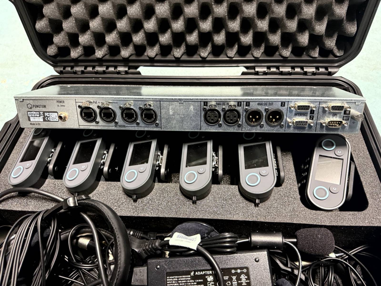 Includes a Q210PW base station, six Q110 beltpacks, four single-ear and three dual-ear headsets, one swan microphone, and a custom case. The system supports four wireless channels and up to four mobile devices, allowing communication on four of thirty-two available partyline channels, compatible with PunQtum wireless intercoms.