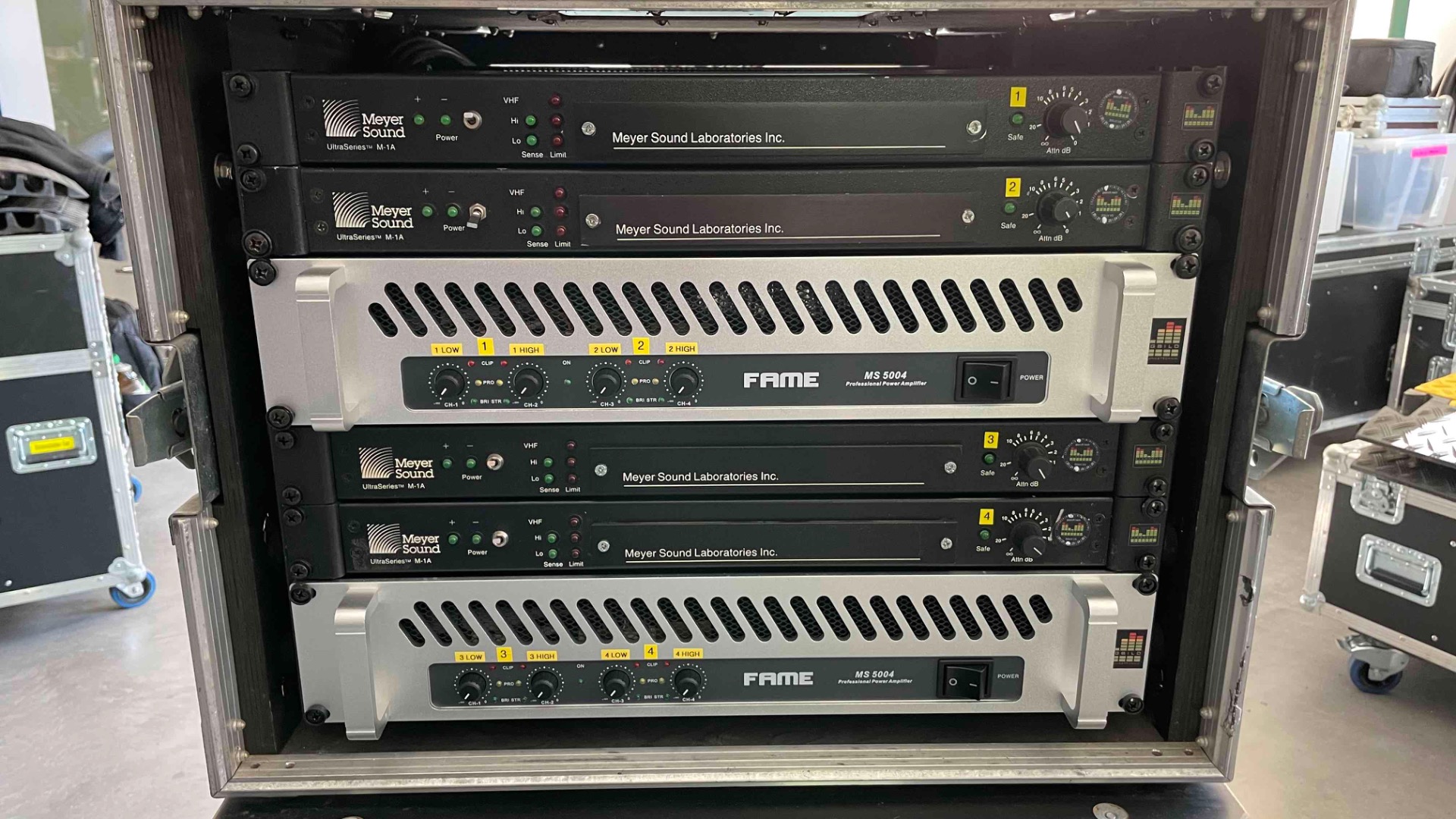 1x Amp Rack 4fach mit 4x Meyer Sound "UltraSeries M-1A" Controller & 2x "Fame MS 5004" Endstufe:
