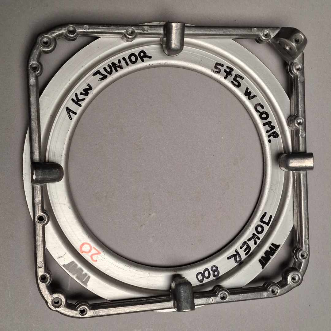 Der Ring passt auch auf eine 100 W Arri Junior (Kunstlicht) oder 800 W Joker Bug von 5600° K. Der Zustand ist gut, die Funktion uneingeschränkt und die auf dem Foto fehlende Schraube ist schon ersetzt.