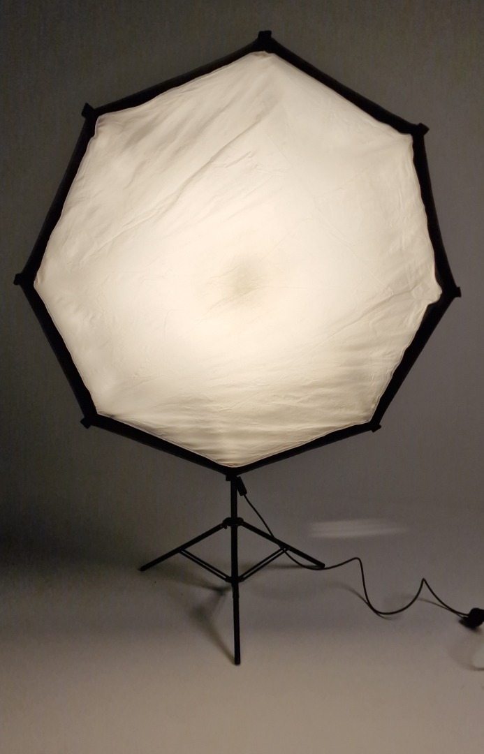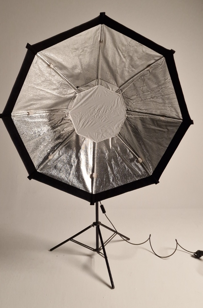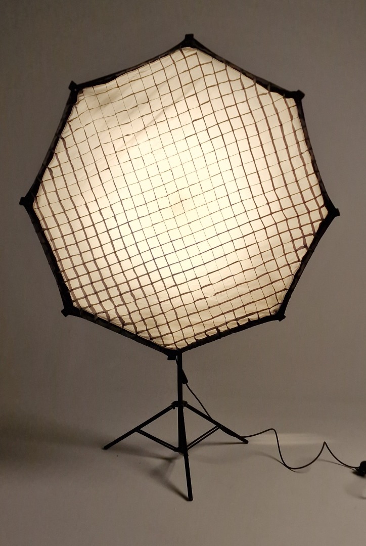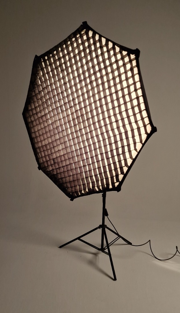 Dies ist eine sehr 5 ft große, softe Kunstlicht Fläche mit sehr geringer Bautiefe. Zur Lampe gehören 3 verschiedene Diffusoren, ein kleiner, der den Hotspot eliminiert, ein mittlerer, der als "Vorfluter" dient und die große Bespannung vorne drauf. Außerdem gehört ein Richtgitter und eine Tasche dazu, das Stativ nicht.