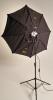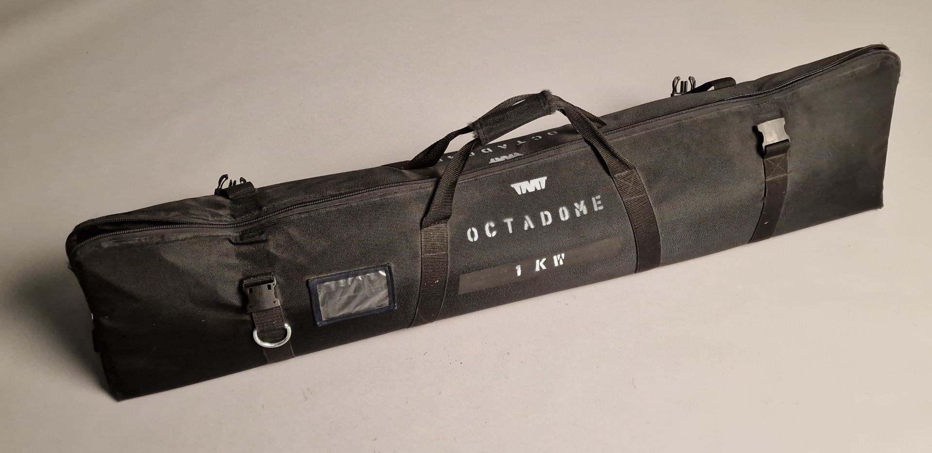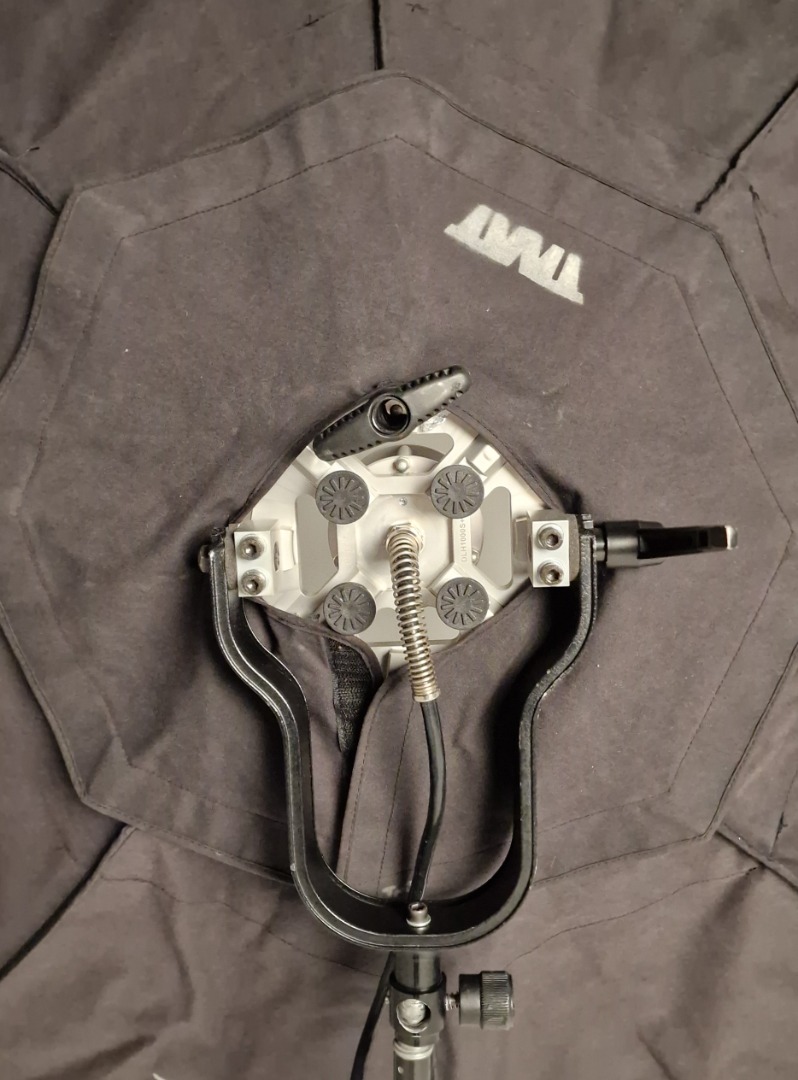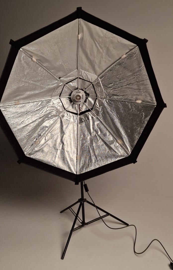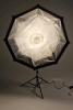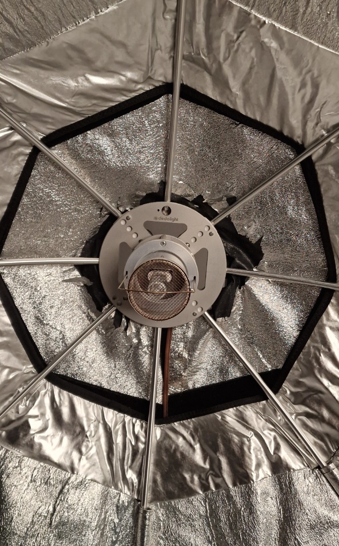Dies ist eine sehr 5 ft große, softe Kunstlicht Fläche mit sehr geringer Bautiefe. Zur Lampe gehören 3 verschiedene Diffusoren, ein kleiner, der den Hotspot eliminiert, ein mittlerer, der als "Vorfluter" dient und die große Bespannung vorne drauf. Außerdem gehört ein Richtgitter und eine Tasche dazu, das Stativ nicht.