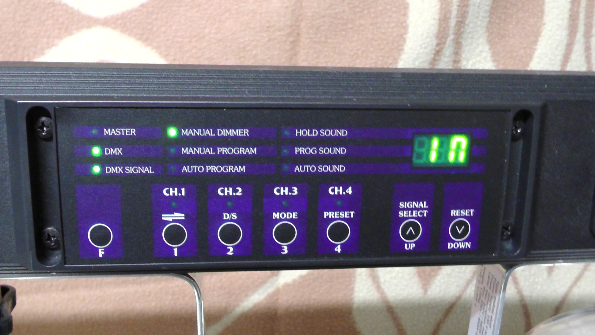 Die Bar lässt sich von DMX-Betrieb auf eingebaute Programme umschalten: Manual Dimmer, Manual Programm, Auto Programm,