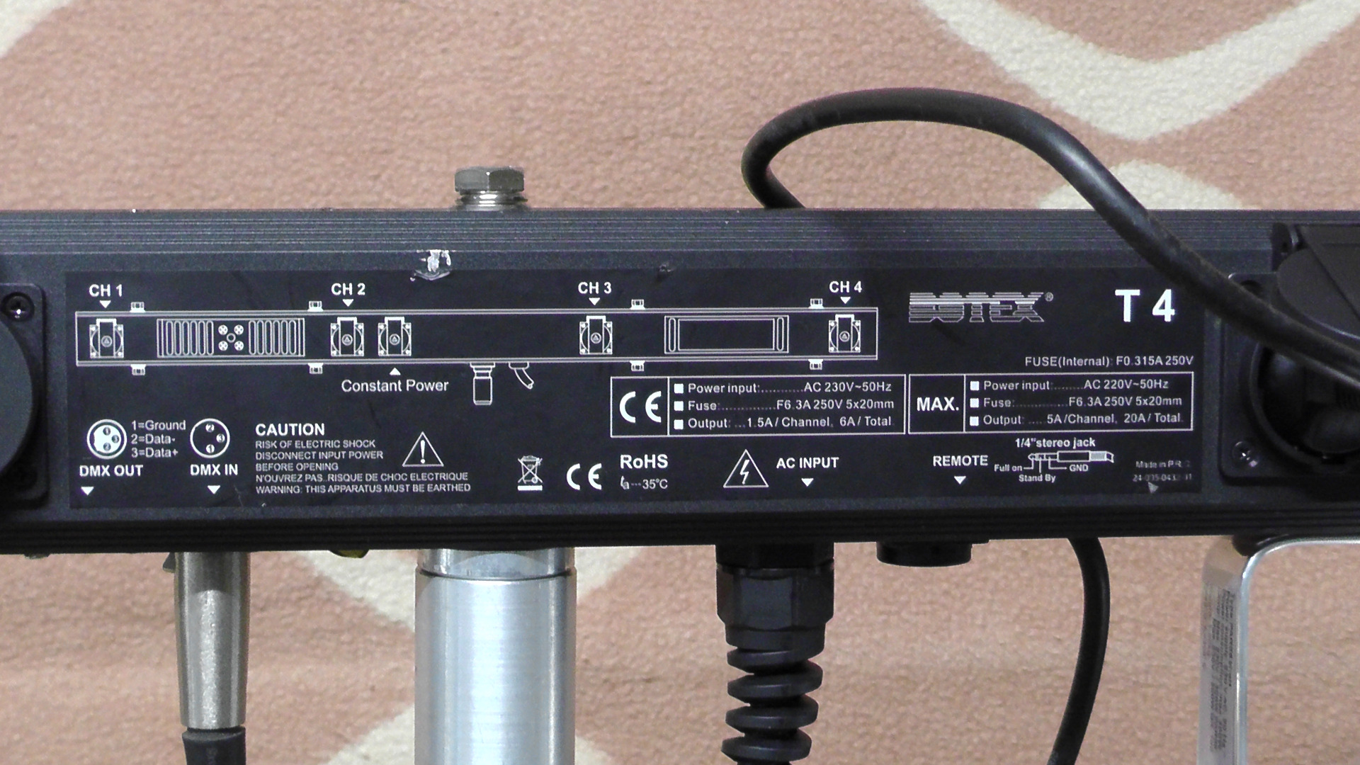 3Pol. XLR für DMX IN und DMX OUT, 1 Klinke 6,3mm für Fußschalter.