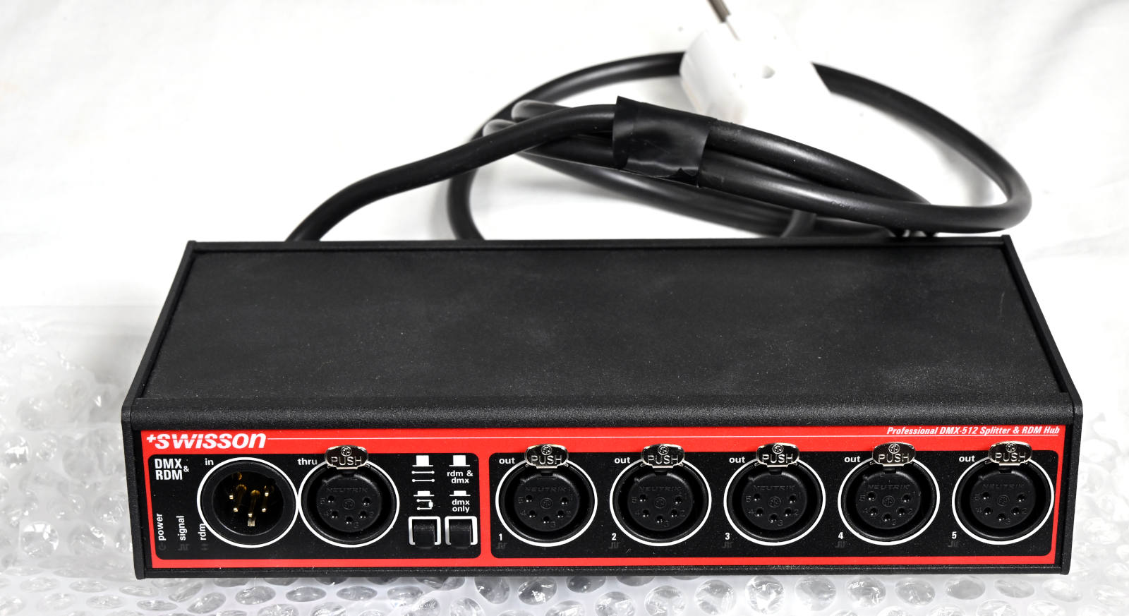DMX and RDM splitter and booster with 5-pin connectors, designed for reliable signal distribution in lighting control setups. Features minimal previous use for dependable performance.