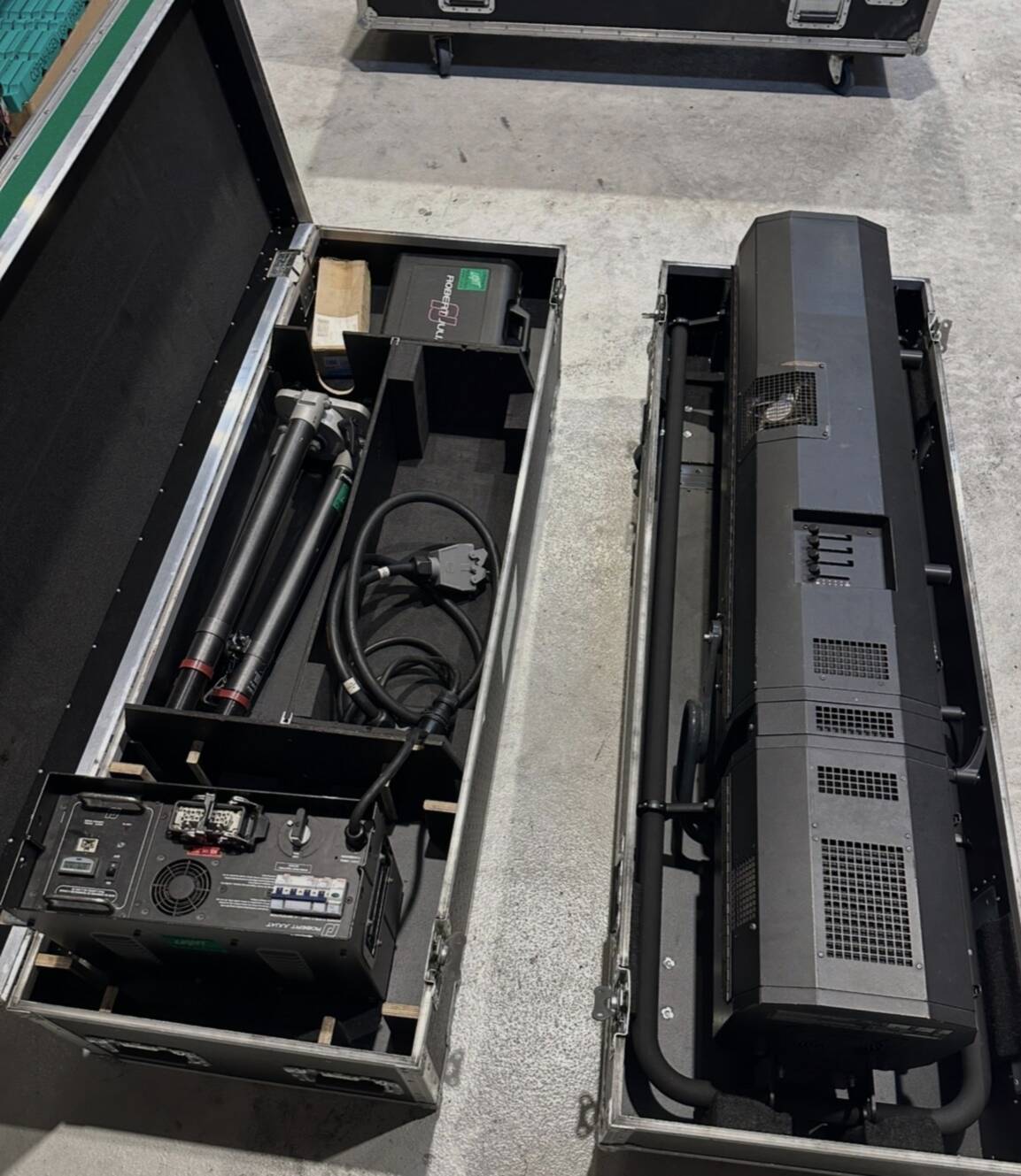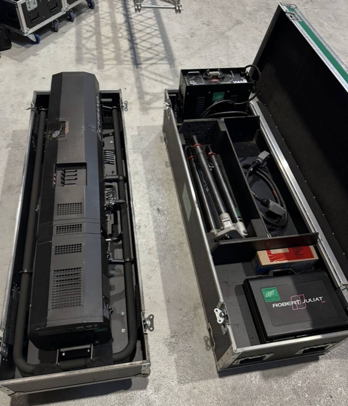 These followspots have minor dents and scratches from festival use, low operational hours (maximum 1,500), and two units feature defective hour counters.